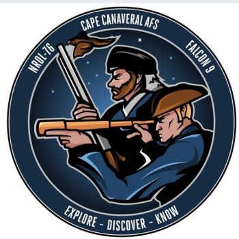 The NROL-76 payload patch may include hints to the satellite's task, showing two explorers (possibly Lewis & Clark), one peering into the distance with a telescope while the other holds a rifle. The words 'Explore – Discover – Know' are depicted on the patch as well as six smaller and a single larger & brighter star.