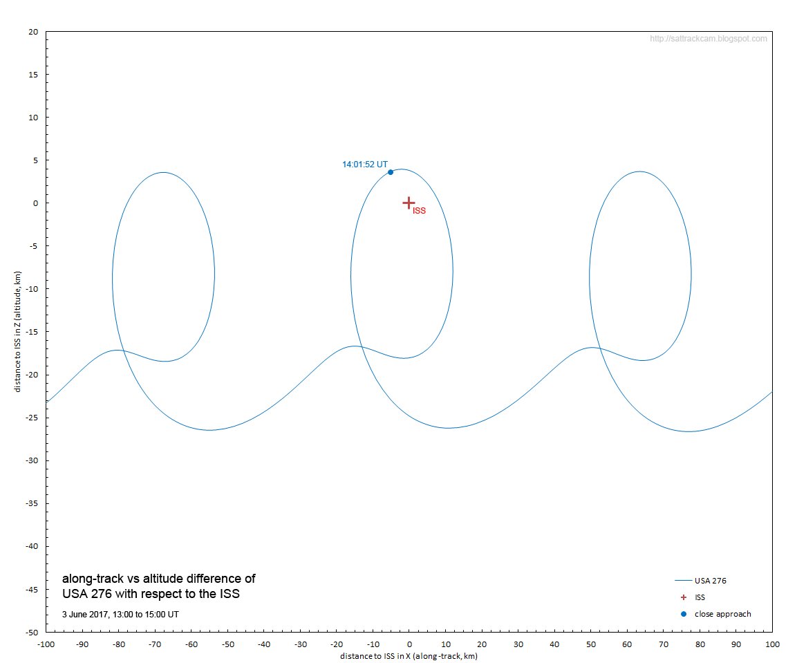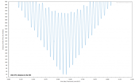 Забавно. Наклонения близки (51.65° и 50.00°), восходящие узлы близки (139° и 144° на 27 мая), периоды немного отличаются, что с учетом начального состояния обеспечивает серию близких пролетов USA-276 мимо станции 3 июня.