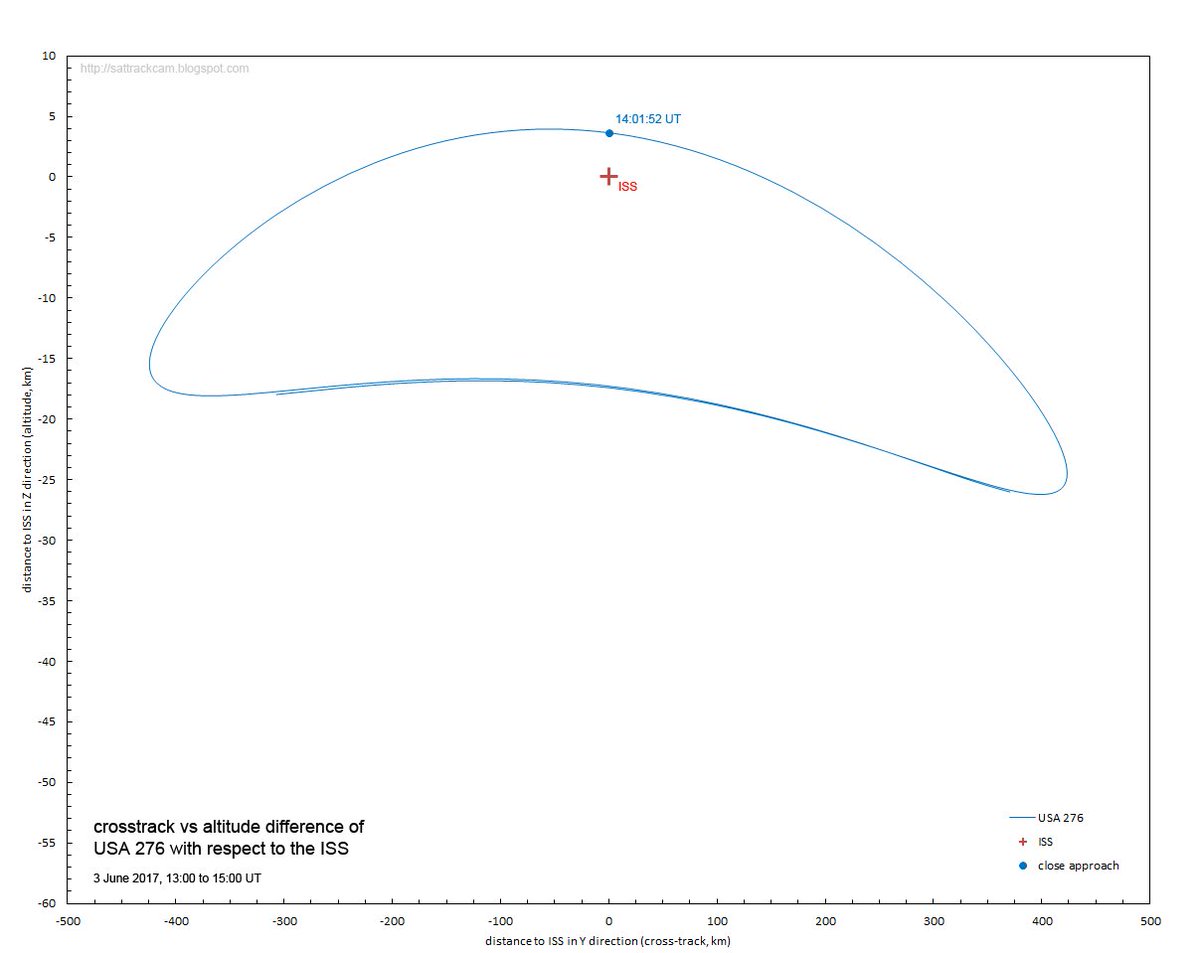 On Jun 3 at 1401:48 UTC, the secret USA 276 satellite launched on May 1 passed less than 4.5 km from the International Space Station
