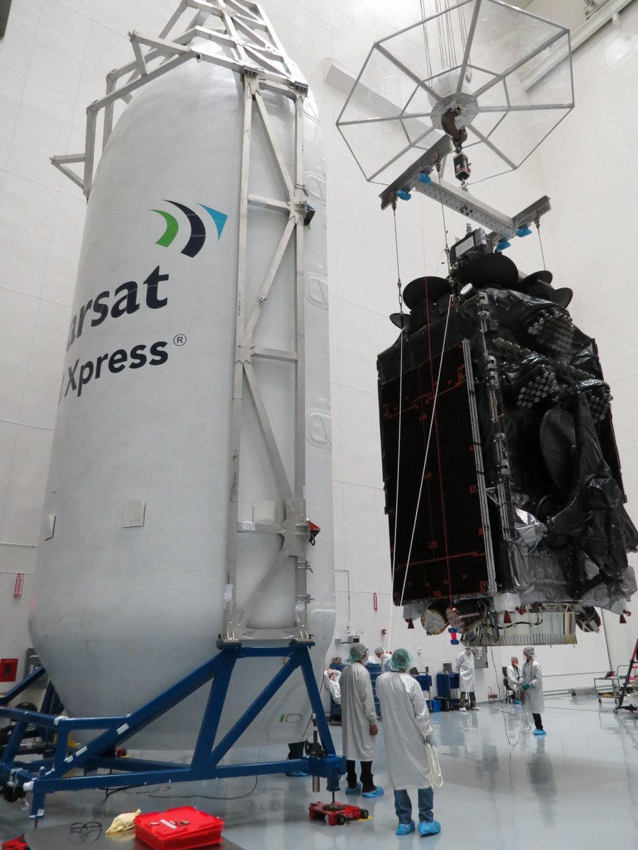 Technicians lifted the spacecraft on the Falcon 9's payload adapter, made by Ruag Space in Sweden, ahead of encapsulation this week inside the rocket's composite payload fairing.  The adapter is fitted with a ring connecting the Inmarsat 5 F4 spacecraft to the Falcon 9's second stage.
