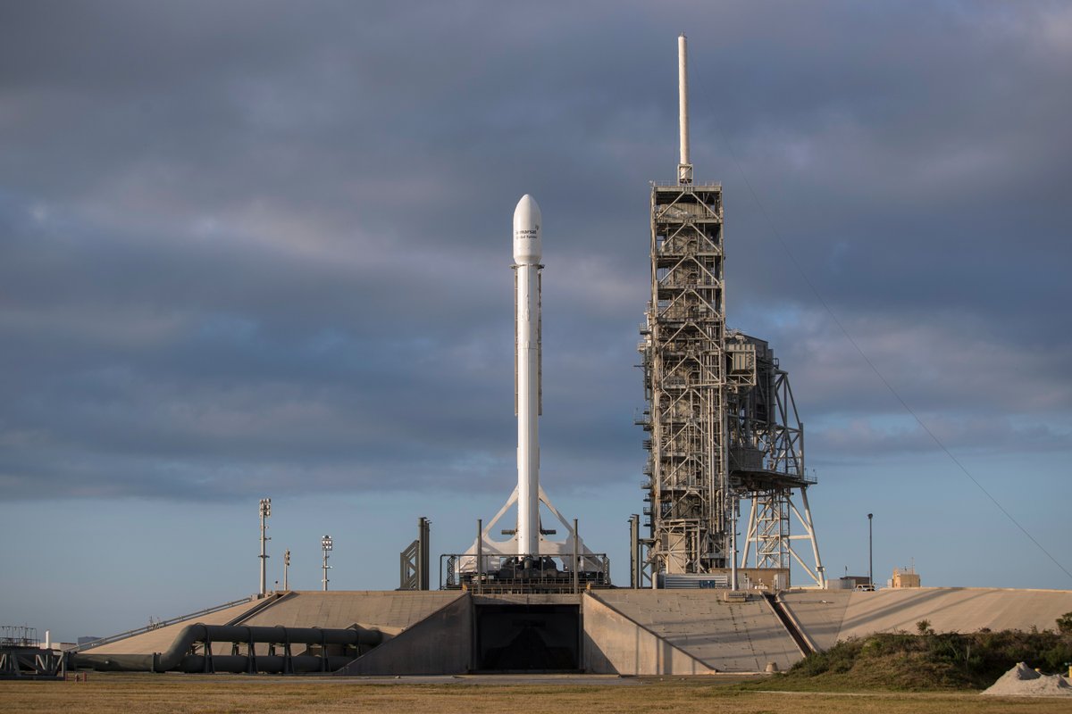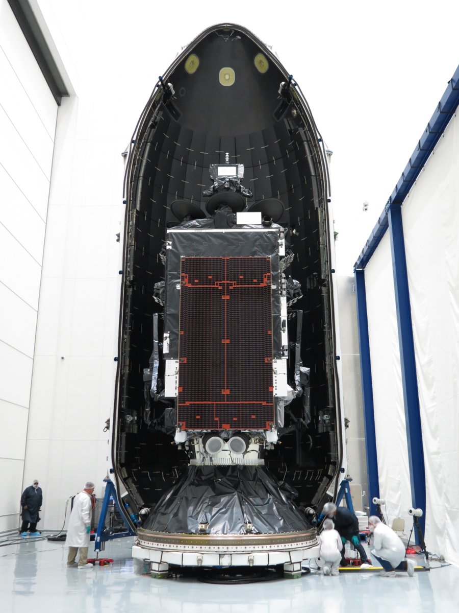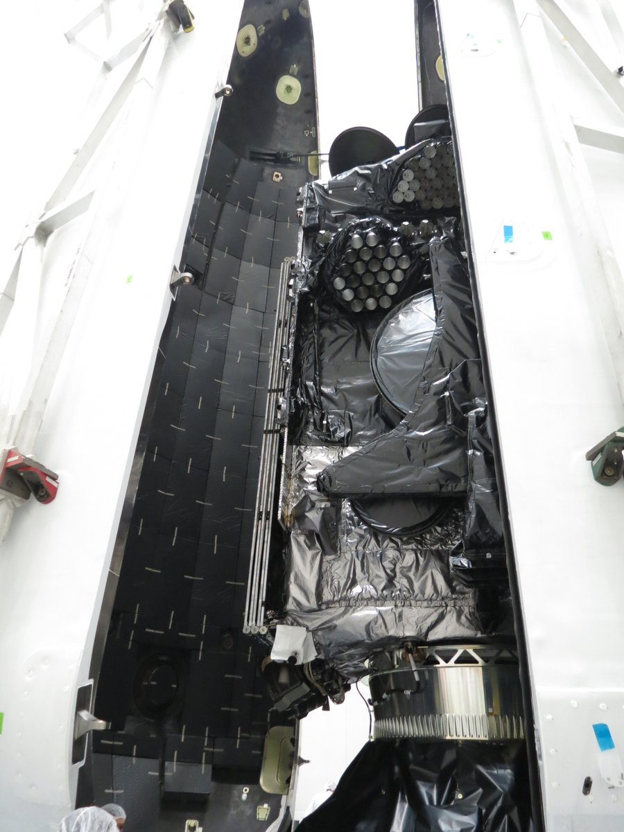 Since the satellite arrived at Cape Canaveral from its Boeing factory in Southern California last month, technicians filled it with 5,372 pounds (2,437 kilograms) of hydrazine and nitrogen tetroxide propellants, fastened it inside the nose fairing of a Falcon 9 rocket, and transferred the spacecraft to SpaceX's nearby hangar, wh ere it was rotated on its side for attachment to the Falcon 9 second stage.