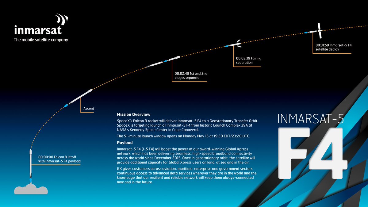 The 13,417-pound (6,086-kilogram) Inmarsat 5 F4 spacecraft is the heaviest commercial telecom satellite launched by SpaceX to date. Based on the Boeing 702HP spacecraft design, the satellite will head into orbit on a 15-year mission to expand broadband coverage for mobile users of Inmarsat's Ka-band Global Xpress service.