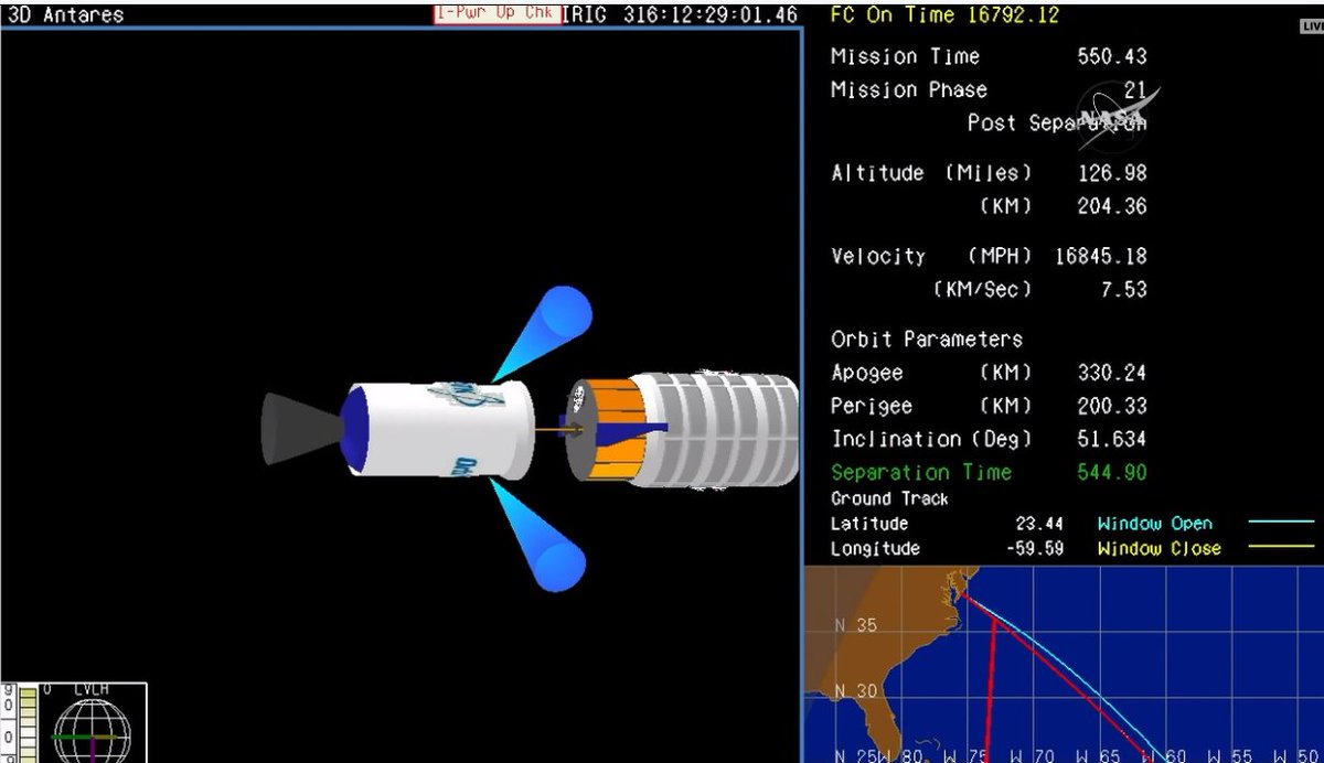 Telemetry displays showed Antares reaching an orbit of 200 by 328 Kilometers, 51.63° at the point of Castor 30XL burnout seven minutes and six seconds into the flight, marking an on-target & slightly-better-than-planned insertion of the vehicle. After burnout, the stage went into a two-minute coast to allow residual thrust to fully tail-off before sending the spacecraft on its way.