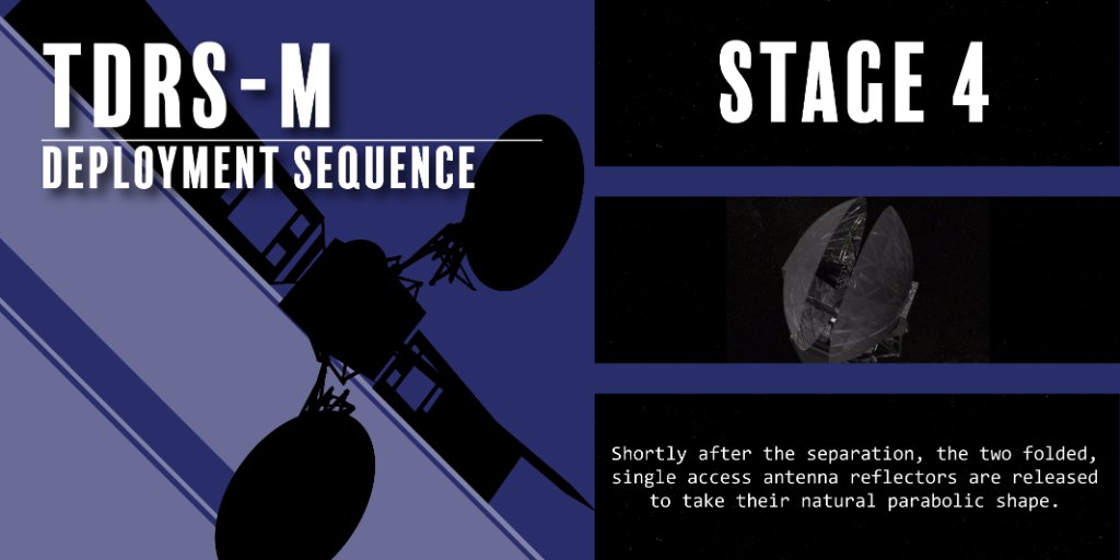 #TDRSM's single-access antennas (the 2 large, round dishes) now unfurl from their stowed state. Deployment stages 1-3 already completed.