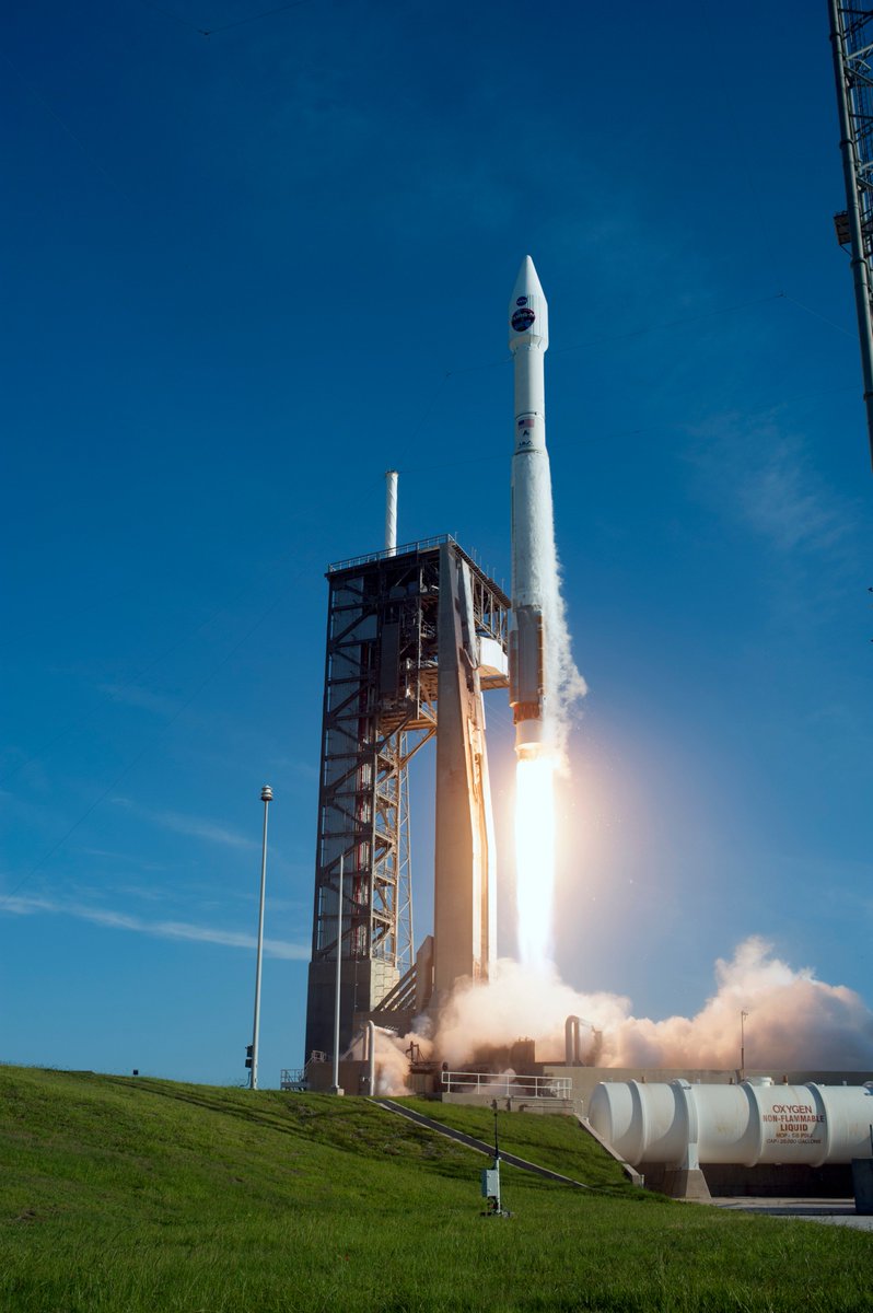 Photo at right: Just before sunrise at Space Launch Complex 41 at Cape Canaveral Air Force Station in Florida, a United Launch Alliance Atlas V rocket vents liquid oxygen propellant vapors during fueling for the lift off of NASA's Tracking and Data Relay Satellite, TDRS-M. Photo credit: NASA/Kenneth Allen