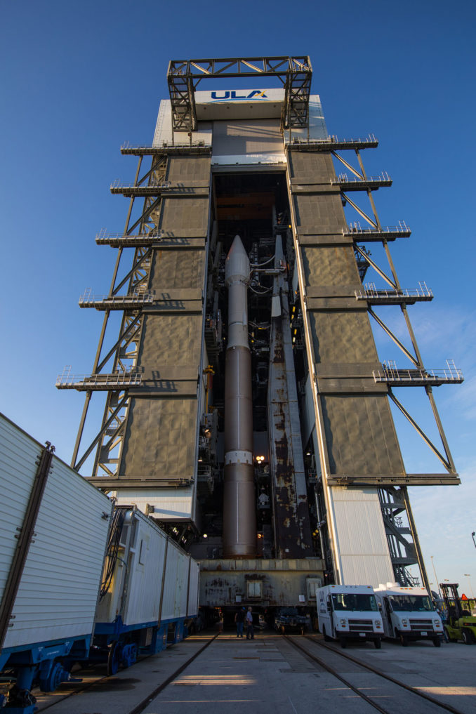 The Atlas 5 began its third-of-a-mile trek to the launch pad with first-motion at 9:08 a.m. EDT (1308 GMT), arriving atop Complex 41 at 10 a.m. The first stage will be filled with 25,000 gallons of RP-1 fuel, a highly-refined kerosene, later today.