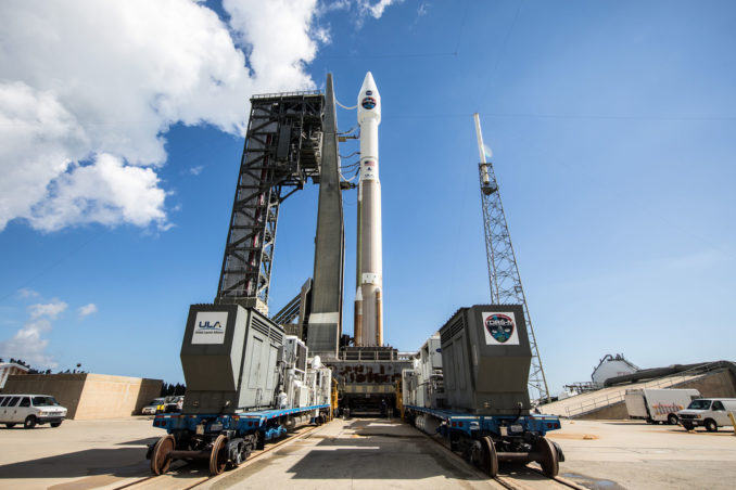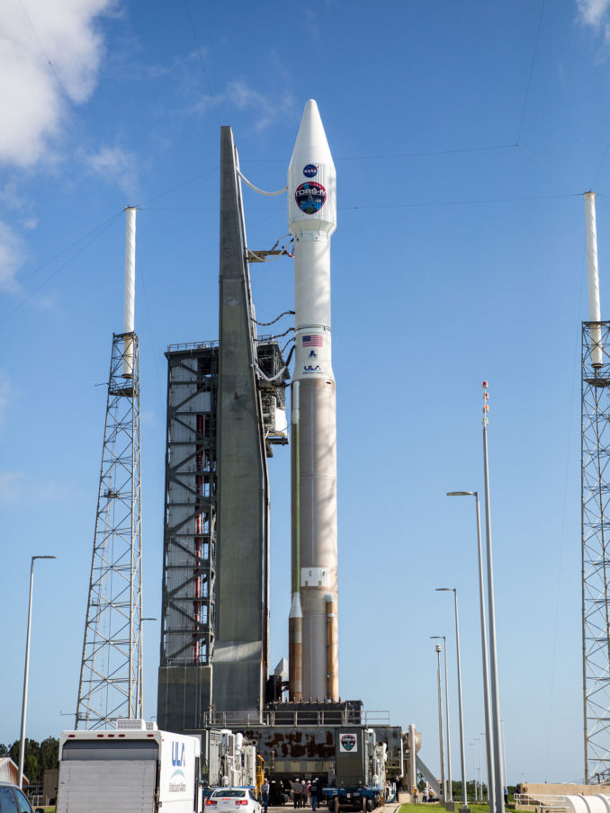 The United Launch Alliance Atlas 5 rocket with the TDRS-M spacecraft aboard moved to the launch pad this morning for liftoff Friday to replenish NASA's data-relay infrastructure in space.