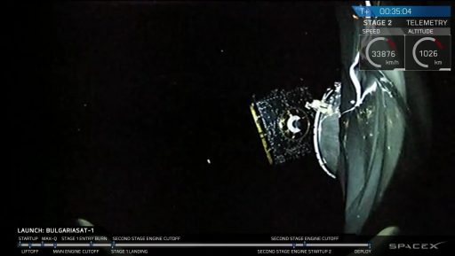 While the first stage returned to a landing in the Atlantic, the Falcon 9's expendable upper stage steered the BulgariaSat 1 satellite into orbit with two engine firings. The robotic broadcasting station, built by Space Systems/Loral in Palo Alto, California, released from the Falcon 9's upper stage around 35 minutes into the mission.