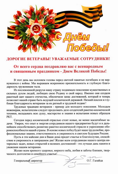 День, который мы отмечаем 9 мая, – по-настоящему самый дорогой и главный праздник для нашего Отечества. Это священная дата не только в истории нашей страны, но и в мировой истории. В канун Дня Победы Генеральный директор ГКНПЦ имени М.В. Хруничева поздравил ветеранов и всех сотрудников предприятия с праздником.