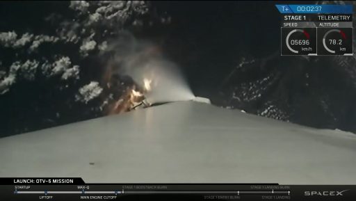 Following guidelines set by the Air Force, SpaceX ended live commentary on the progress of the second stage's flight less than three minutes after liftoff. Video coverage of the booster's plunge back to Earth continued, and three of the first stage's Merlin 1D powerplants restarted high over the Atlantic Ocean for "boost-back" and "entry" burns to steer the rocket back toward land.