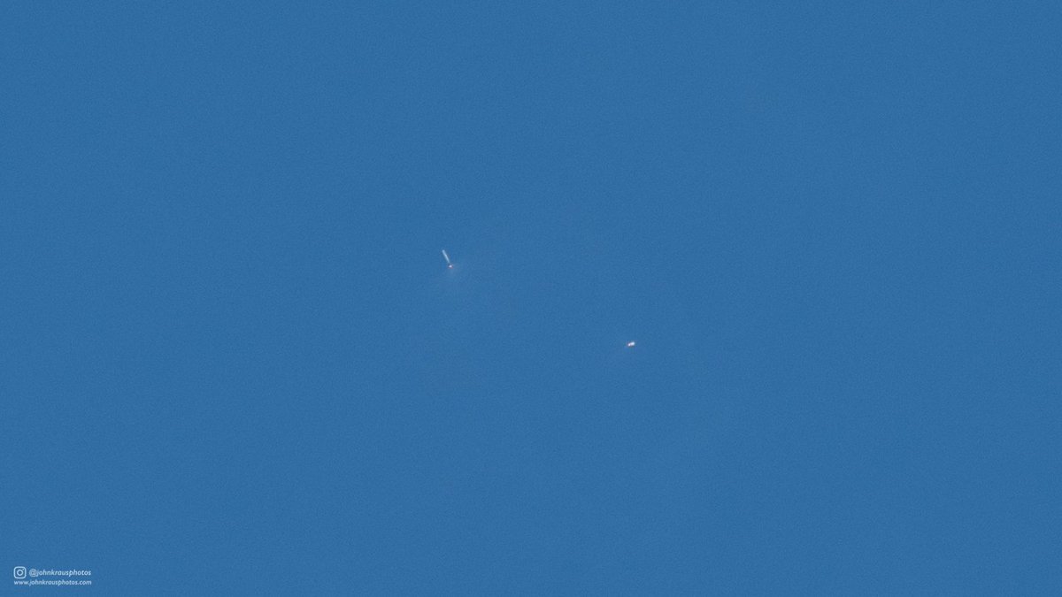 The first stage finished its role in the primary mission two minutes and 24 seconds into the flight, having boosted the vehicle to a speed of 1,660 meters per second. Stage separation occurred three seconds later at an altitude of 69 Kilometers with the first stage heading off on its return to Cape Canaveral while the second stage went into start-up mode for the boost into orbit.
