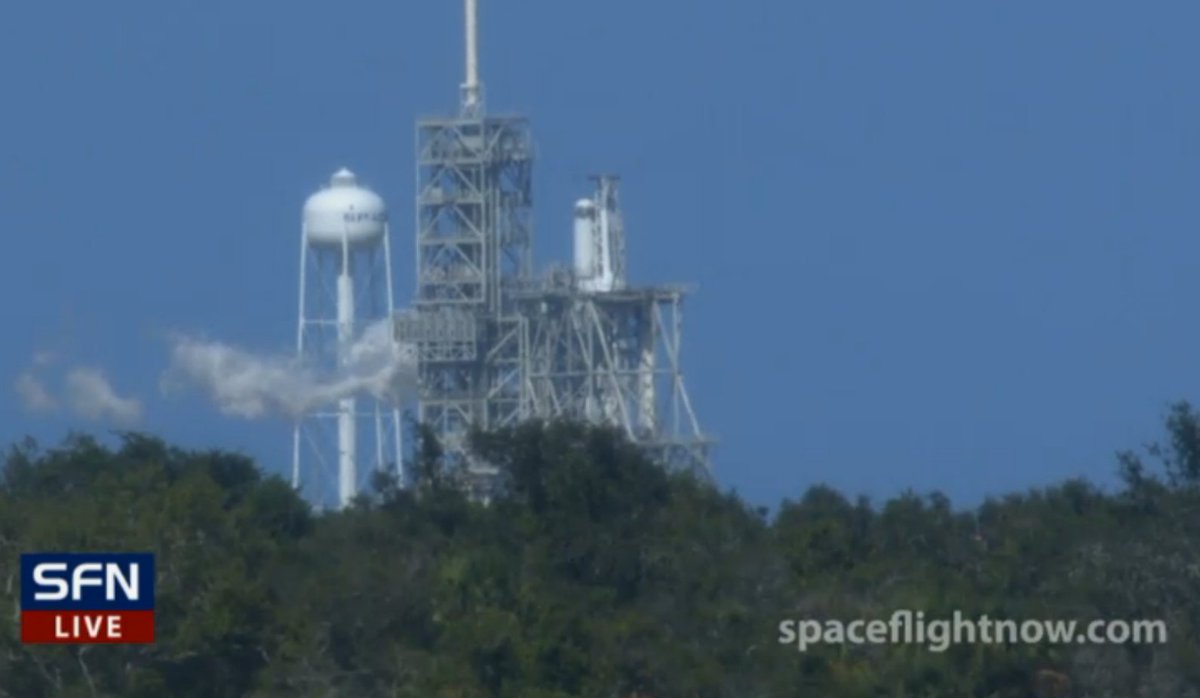 The first signs of venting have appeared near the Falcon 9 rocket at pad 39A, an indication that preparations are underway to fill the launcher with super-chilled kerosene and liquid oxygen propellants ahead of this afternoon's static fire test.