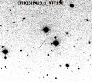 Изображение квазара CFHQS в видимом диапазоне, полученное телескопом РТТ-150. 150 (положение квазара указано длинной косой чертой). Фотоны от квазара на этих изображениях были испущены 12,8 миллиарда лет назад при аккреции вещества на сверхмассивную черную дыру массой не менее 2 миллиардов солнечных