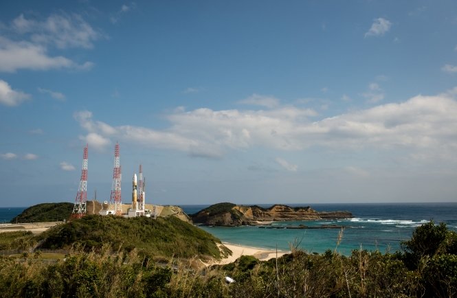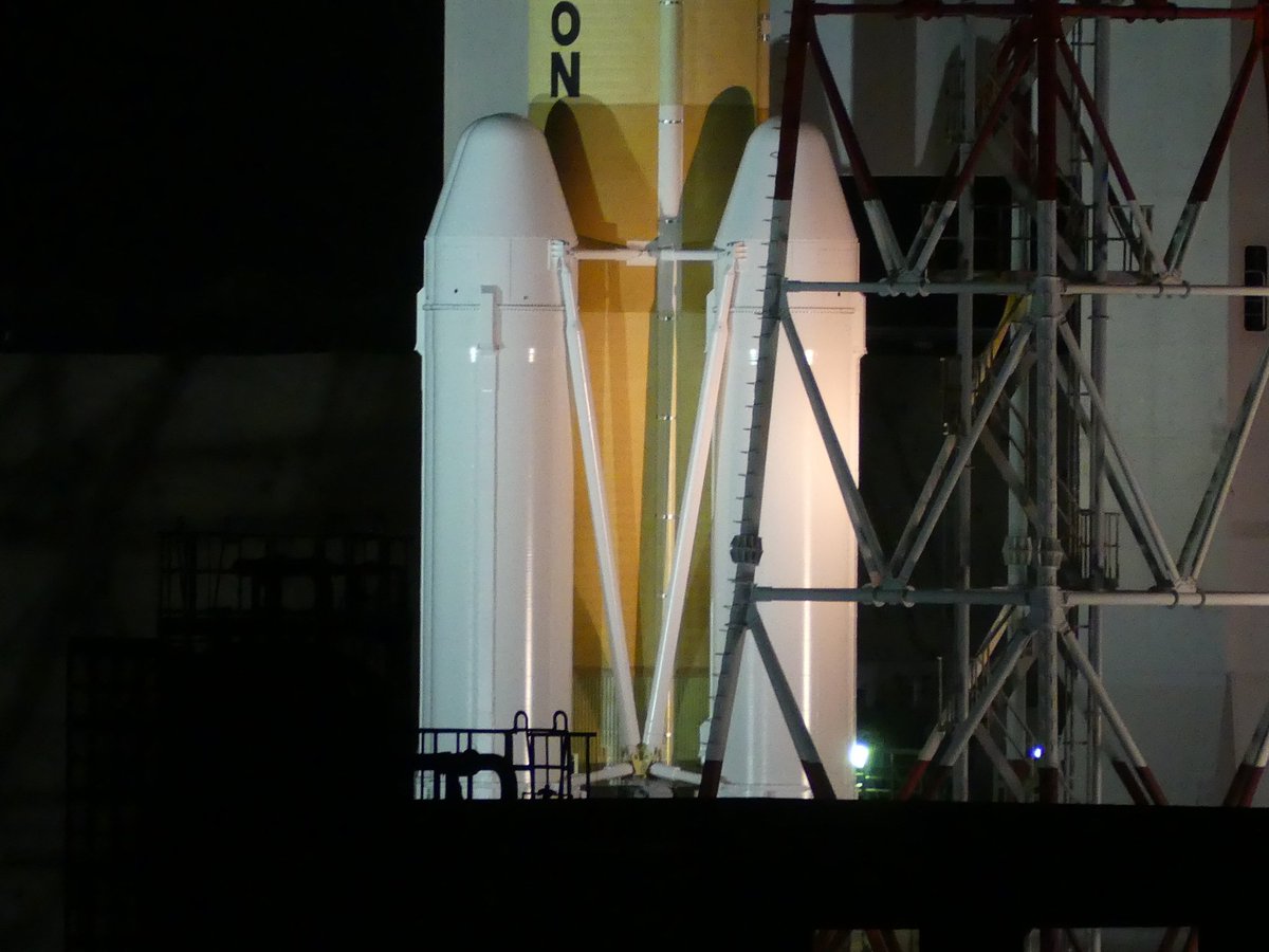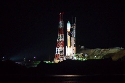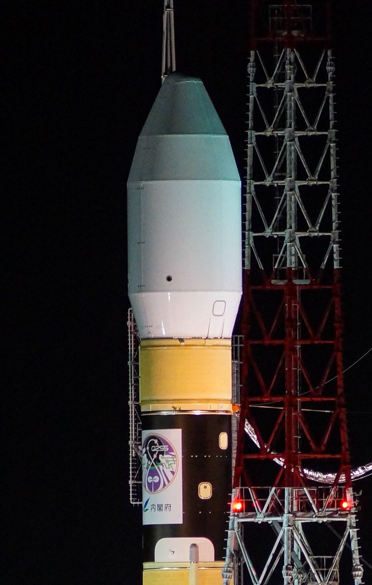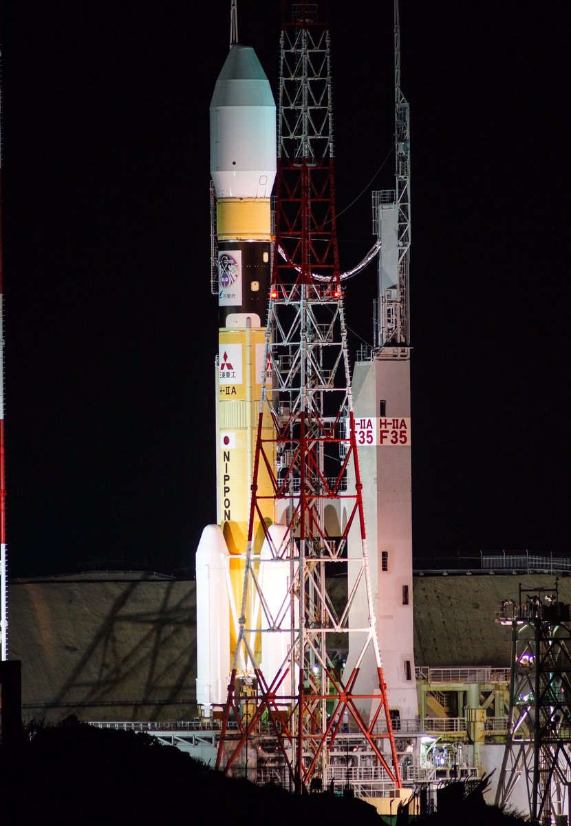 H-IIA emerged from its assembly building at the midnight hour for a 30-minute trip to cover 500 meters to Launch Pad 1 at the sea-side launch complex. Once at the pad, the rocket's Mobile Launch Platform will be hooked up to propellant, power and data interfaces and undergo power-up operations for an initial series of checkouts. H-IIA will press into propellant loading around seven hours and 45 minutes before the opening of the day's launch window, pumping 120 metric tons of -183°C Liquid Oxygen and -253°C Liquid Hydrogen into the two cryogenic rocket stages.