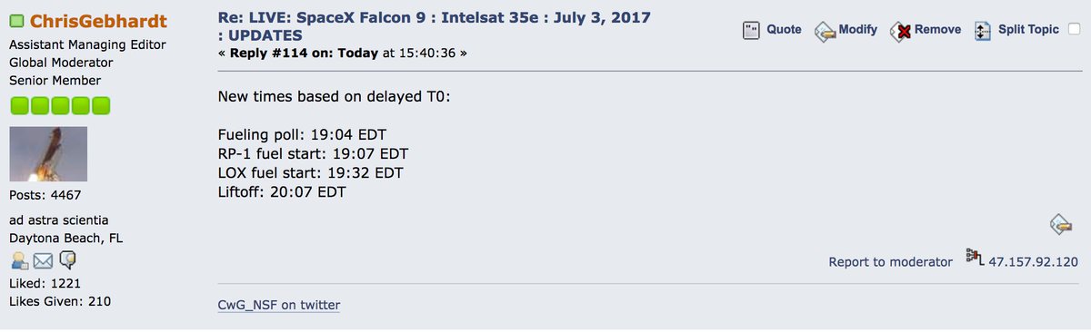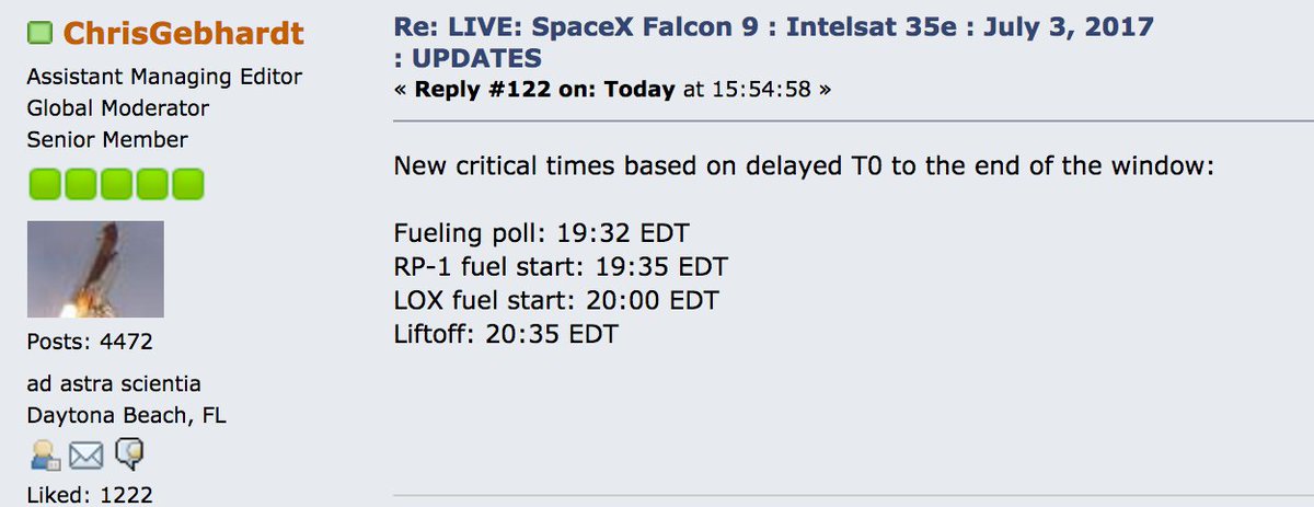 Updated critical event times based on new launch time of 20:07 EDT (8:07p EDT). #SpaceX #Falcon9 #Intelsat35e
