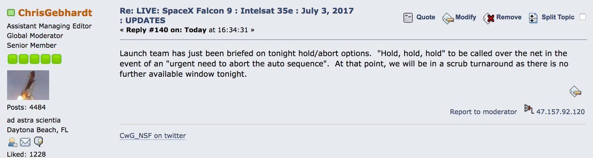 Launch team was just briefed on tonight's countdown hold/abort options: #SpaceX #Falcon9 #Intelsat35e