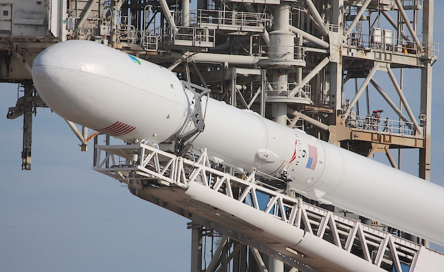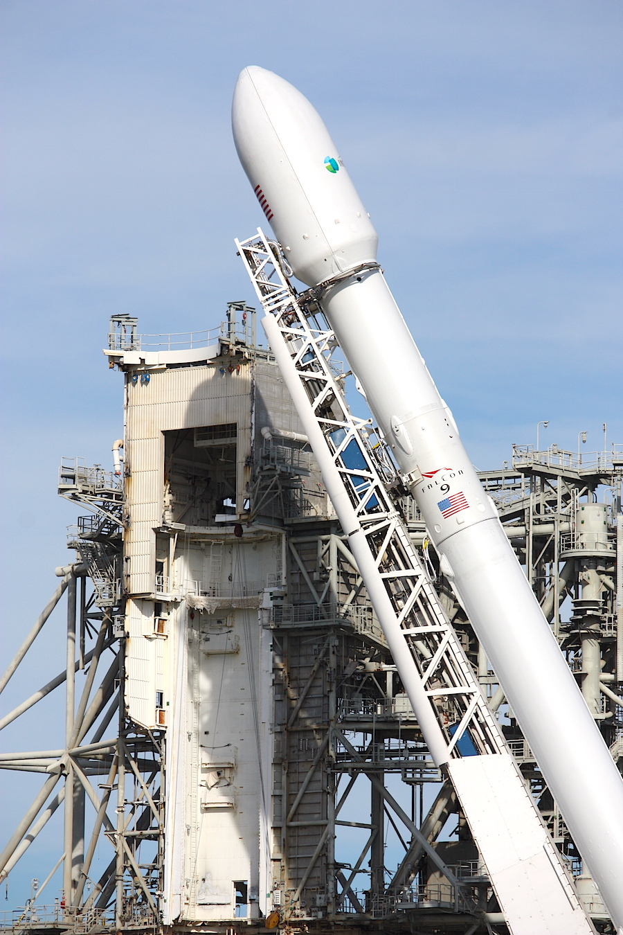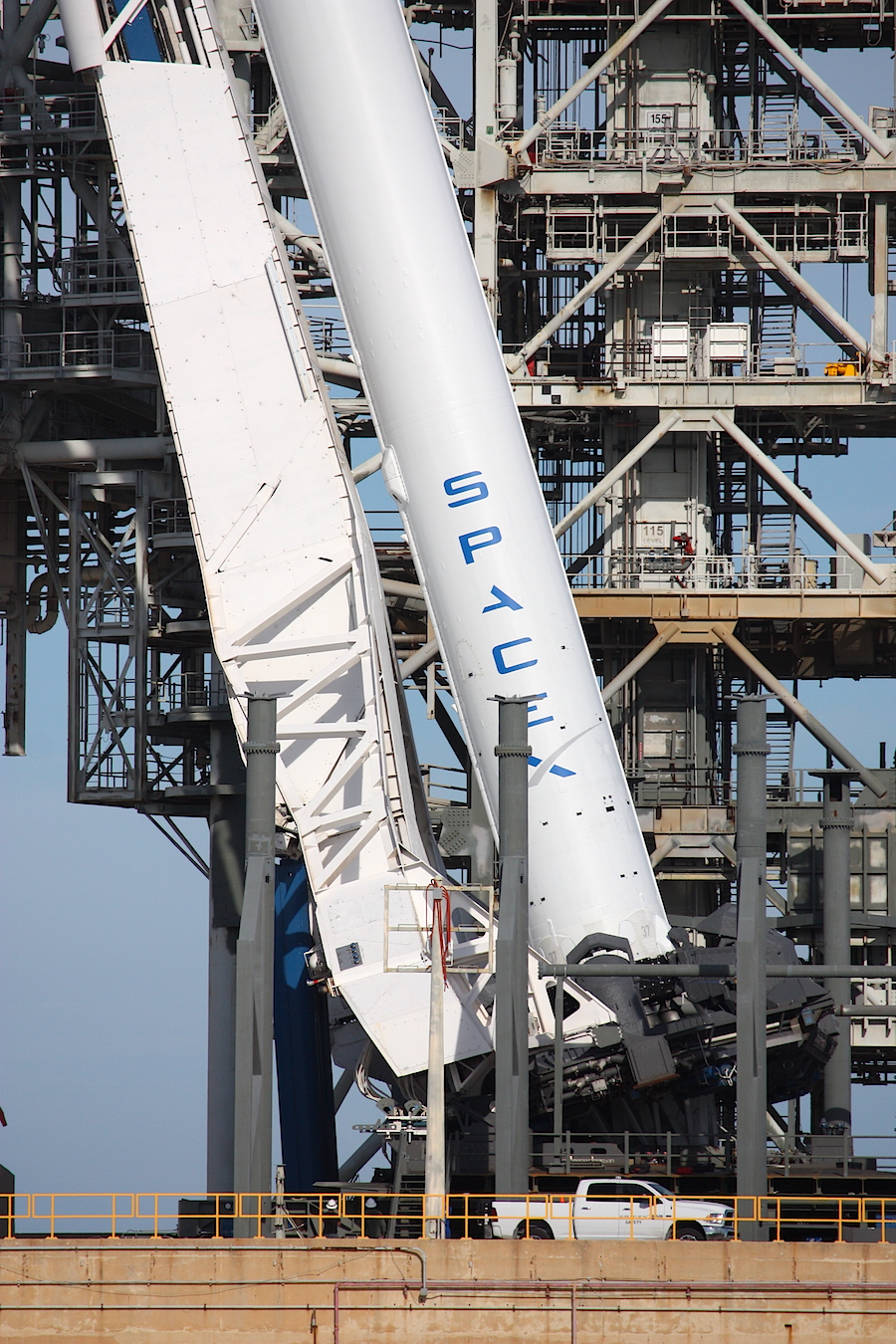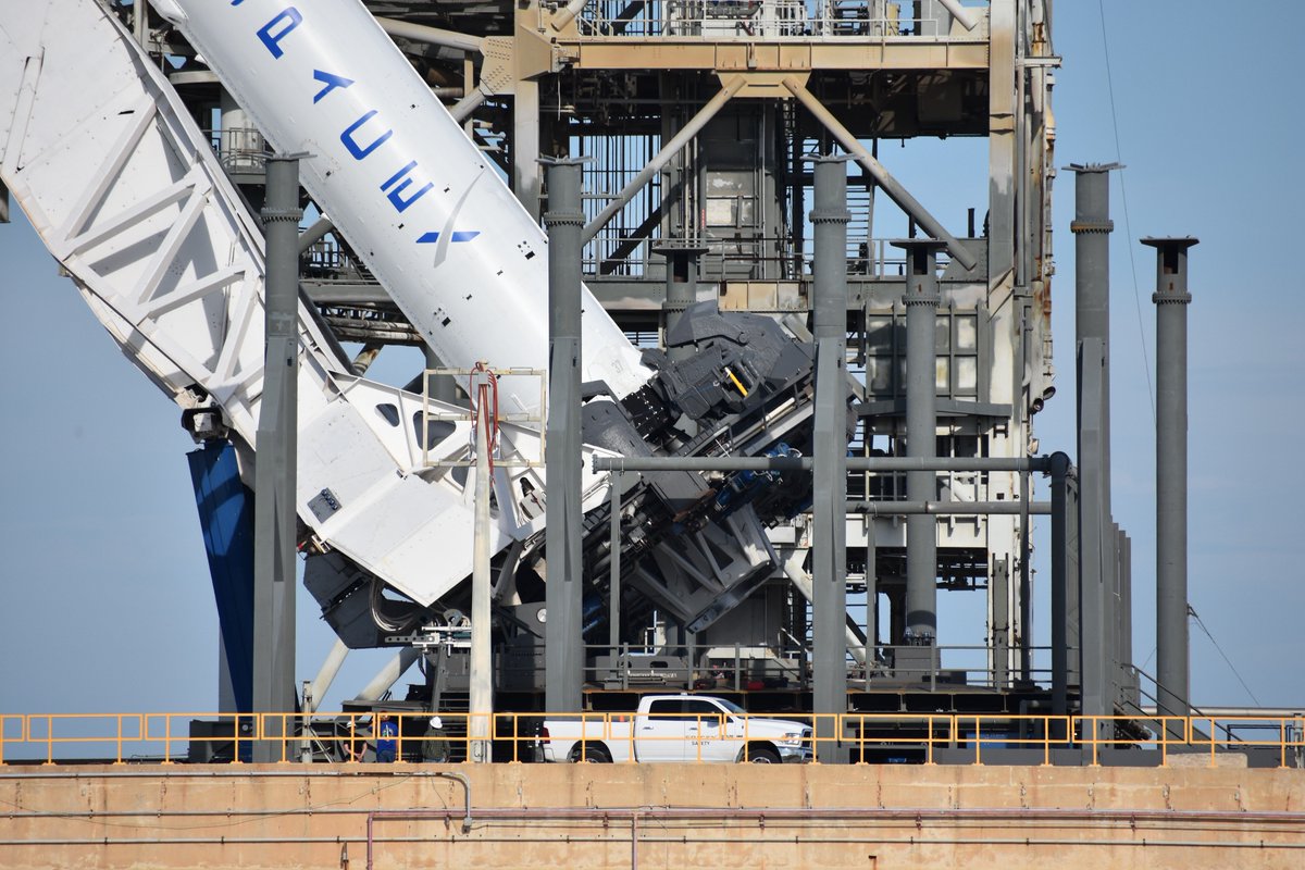 SpaceX's Falcon 9 rocket was hydraulically hoisted upright again at pad 39A this morning, getting in position for liftoff at 7:36 p.m. EDT (2336 GMT).
