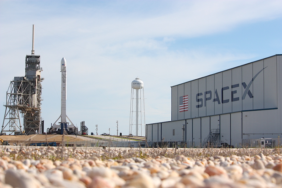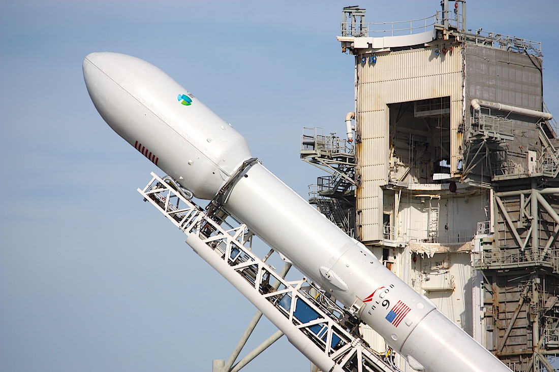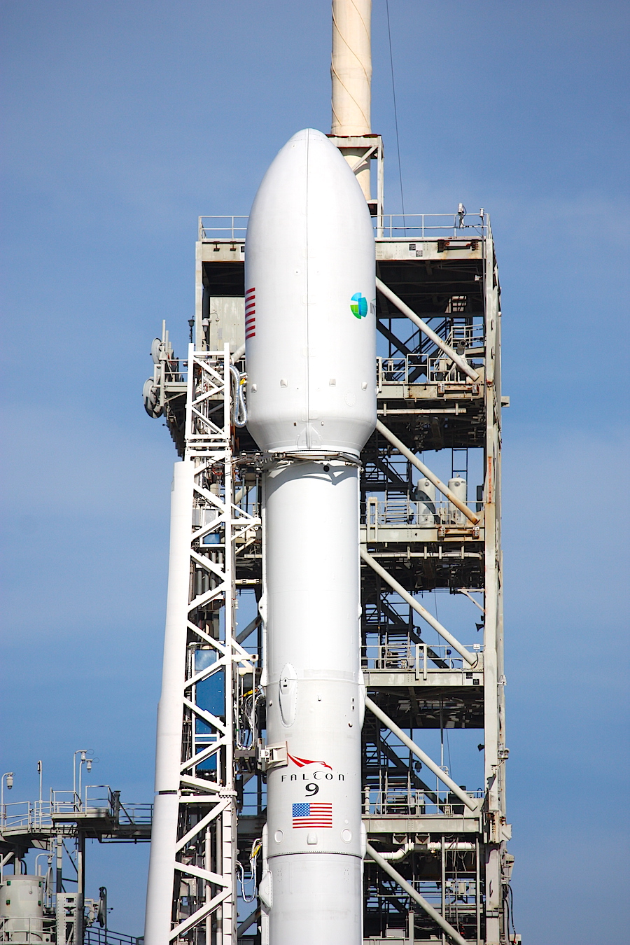 SpaceX photo of the Falcon 9 that's set to launch Intelsat 35e later today. No legs and fins looks a bit strange these days...