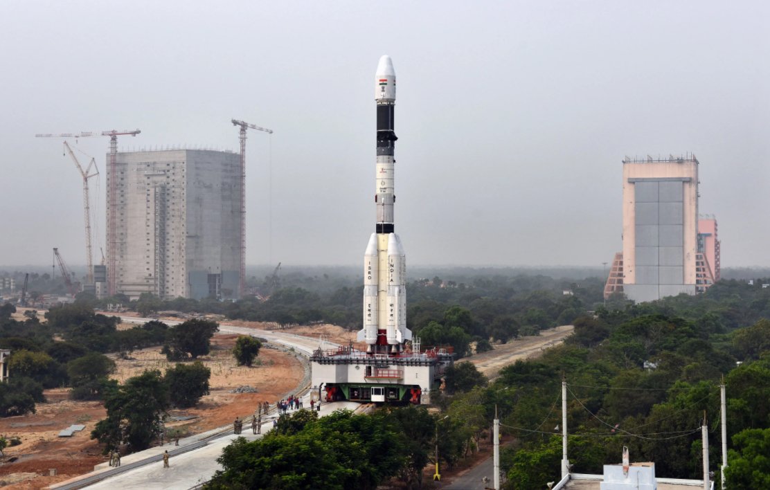 Crews at the Indian spaceport on Sriharikota Island transferred the GSLV Mk.2 rocket to its launch pad earlier this month after its build-up inside a vertical hangar. The roughly kilometer-long rollout fr om the Vehicle Assembly Building to the space base's so-called Second Launch Pad occurred along rail tracks, and three swiveling access arms swung into position around the rocket after it arrived at the launch complex.