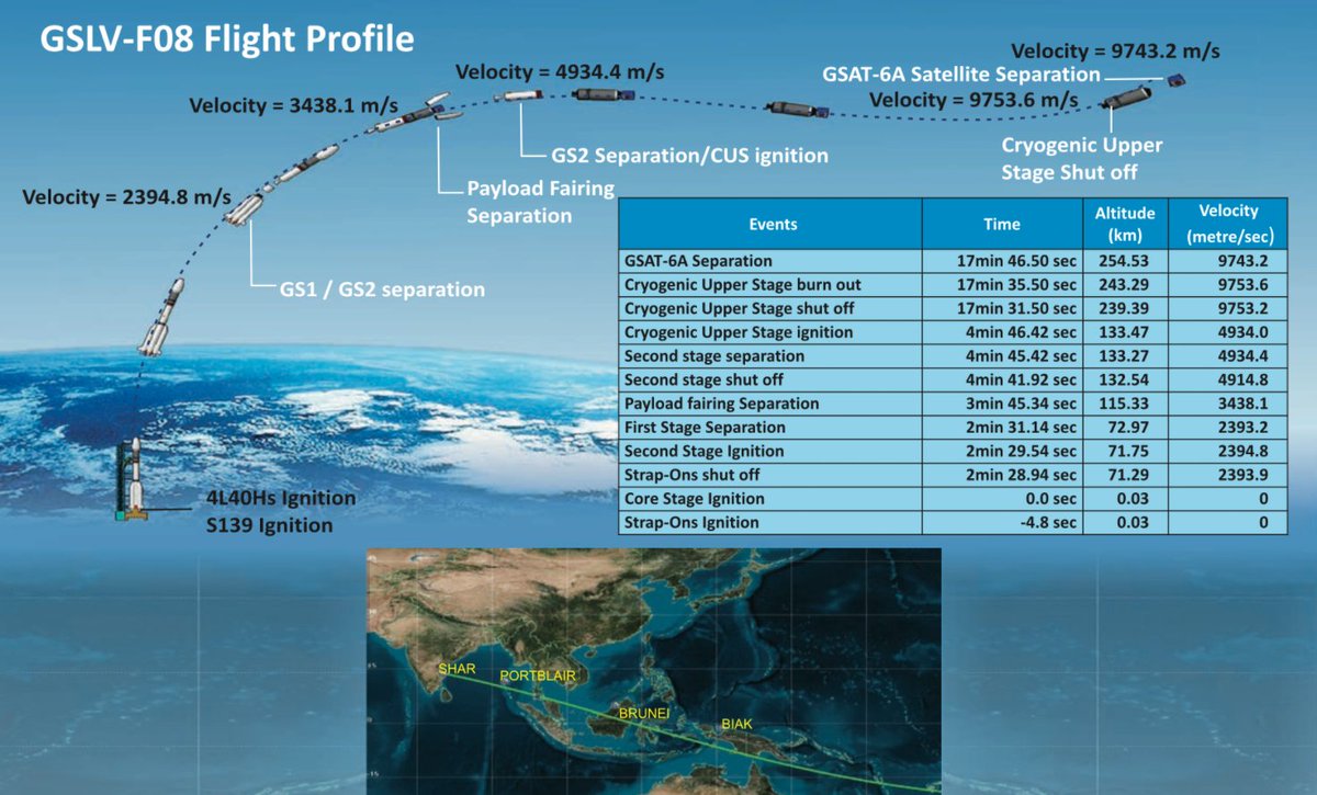 GSLV will drop its 3.4-meter diameter payload fairing three minutes and 45 seconds into the flight when passing through 115 Kilometers in altitude wh ere aerodynamic forces can no-longer harm the satellite. Separation of the GS2 stage occurs at T+4 minutes and 45 seconds and will be followed one second later by the ignition of the CE-7.5 cryo engine on a long burn of 12 minutes and 45 seconds – tasked with increasing the rocket's speed by almost five Kilometers per second to an injection velocity of 9.7 km/s.