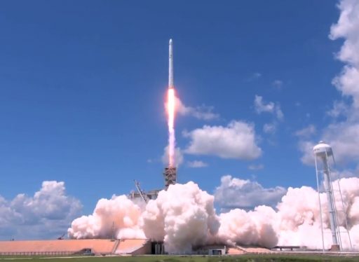 Soaring to a thrust of over 700 metric-ton-force, Falcon 9 lifted off the former Saturn V & Space Shuttle launch pad at precisely 16:31:37 UTC, balancing in a vertical posture for 15 seconds before pitching over to attain a north-easterly heading for a fast trip across the Atlantic Ocean.