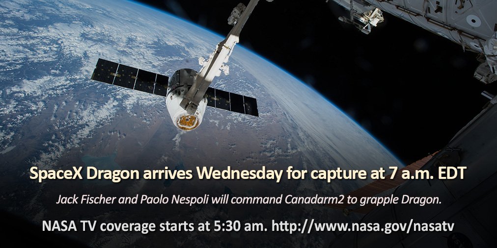 Capture of the automated supply ship by the station's robotic arm is scheduled for 7 a.m. EDT (1100 GMT). Flight engineer Jack Fischer aboard the complex will manually command the arm to grapple the Dragon spacecraft.