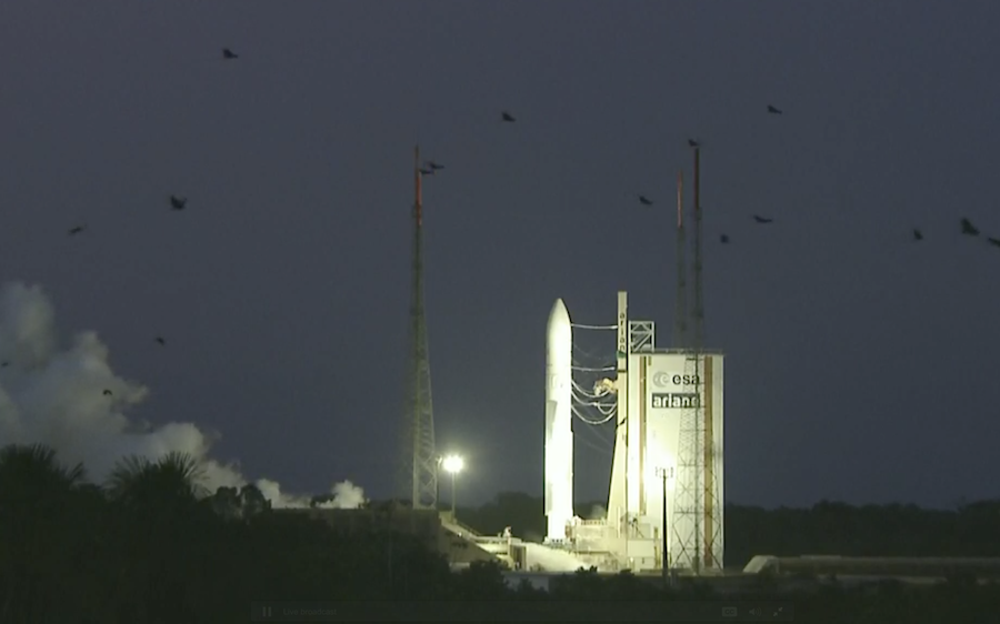 Lifting two GEO satellites at once has become Ariane's bread and butter business and Tuesday's launch was expected to be no different. The 55-meter tall rocket was rolled to the ELA-3 launch pad at the Guiana Space Center on Monday and entered countdown operations on Tuesday at 10:28 UTC, gearing up for the opening of a 33-minute launch window at 21:51 UTC, 6:51 p.m. local time or just 15 minutes after sunset and perfectly clear skies expected for the opportunity.