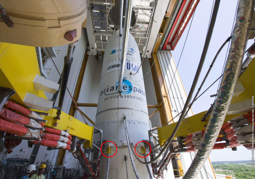 The upper stage's propellant drainage lines are circled in red, while the yellow umbilical arms, which retracted in the final countdown. This image of the launcher was taken before rollout to the launch pad. Credit: ESA/CNES/Arianespace – Photo Optique Video du CSG – P. Baudon
