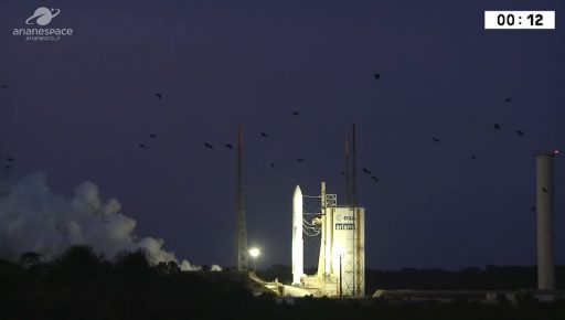 Ariane 5 went into power up operations after 11 UTC and completed an extensive series of tests before heading into propellant loading to receive 184 metric tons of supercold Liquid Oxygen and Liquid Hydrogen. Propellants were kept topped up at flight level throughout the countdown and the colorful sunset provided a fitting backdrop to the launch vehicle as it entered a final computer-controlled countdown sequence at T-7 minutes to transition to an autonomous configuration.