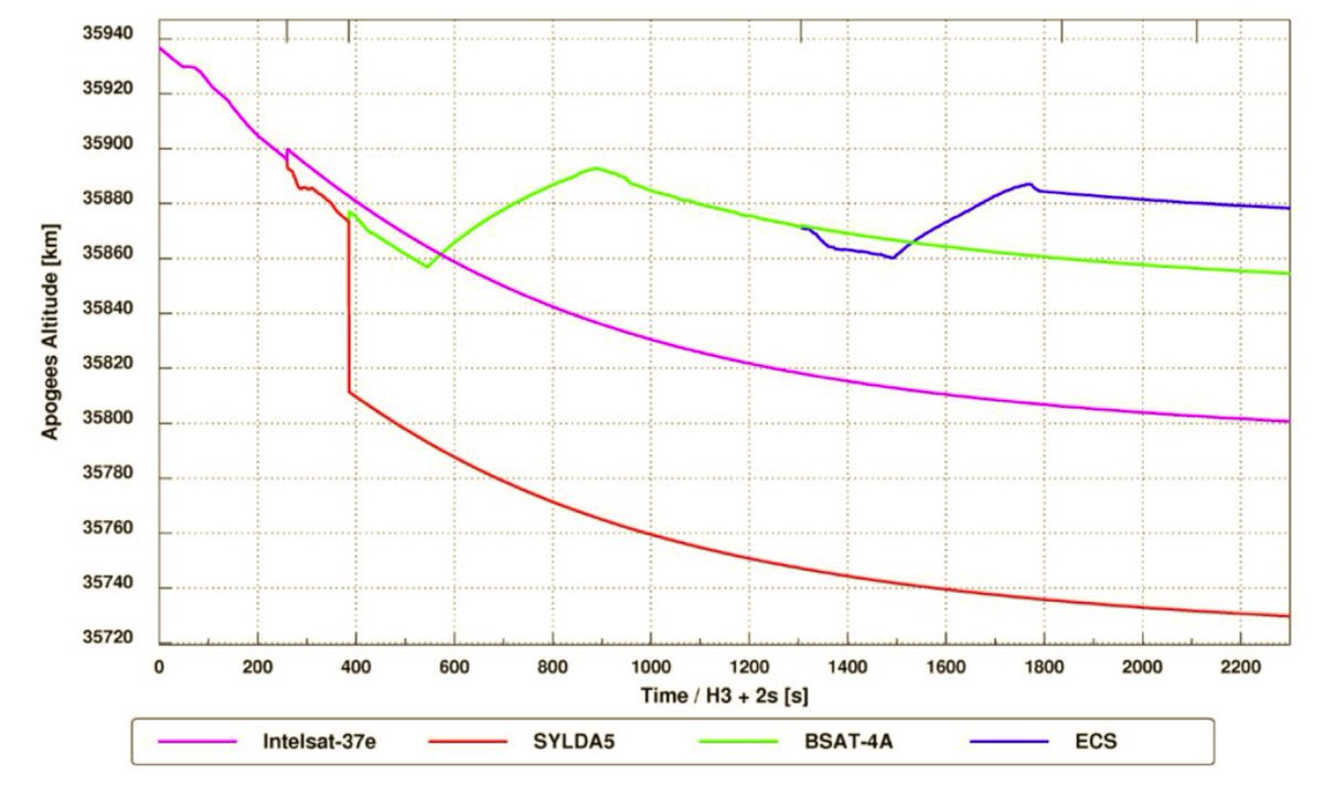 The HM7B engine shuts down after placing the Intelsat 37e and BSAT 4a satellites into geostationary transfer orbit with a low point of 155 miles (250 kilometers), a high point of 22,186 miles (35,706 kilometers), and an inclination of 6 degrees to the equator.