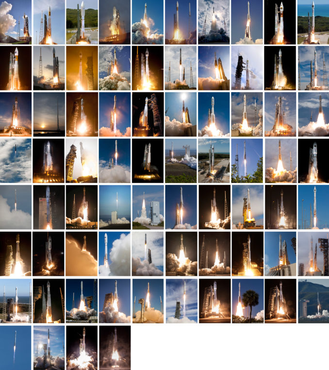 The Atlas 5 rocket has performed 74 launches. Stats now stand at 26 flights dedicated to the Defense Department, 17 commercial missions, 16 for the National Reconnaissance Office and 15 for NASA. Photos by Pat Corkery, Jeff Spotts, Ben Cooper, Walter Scriptunas II, James Murati, Gene Blevins, Bill Hartenstein, Alex Polimeni and Justin Ray