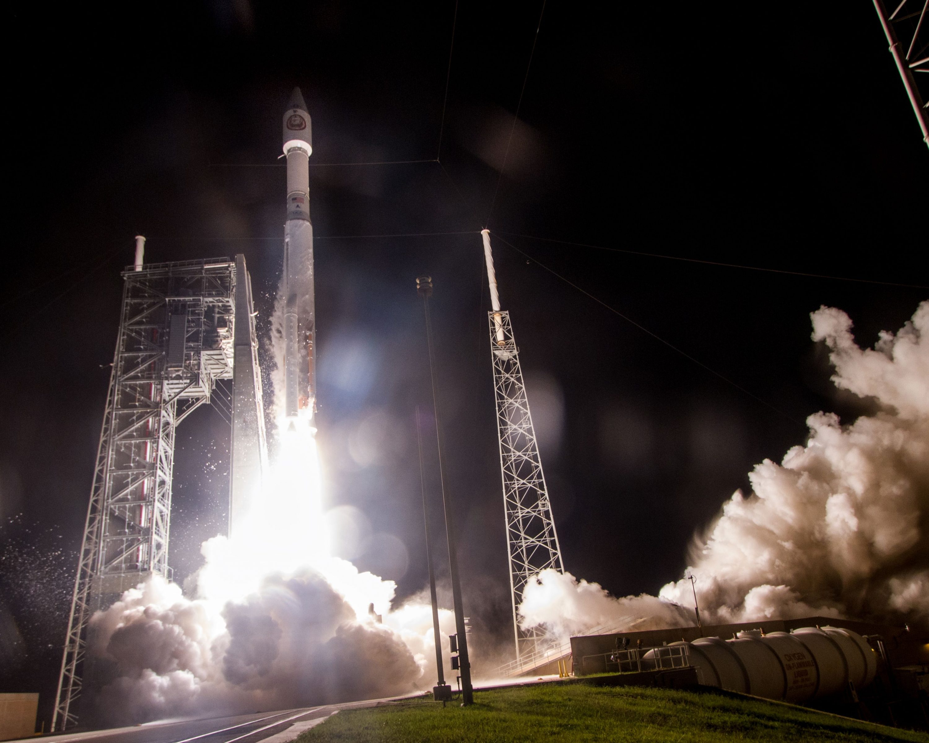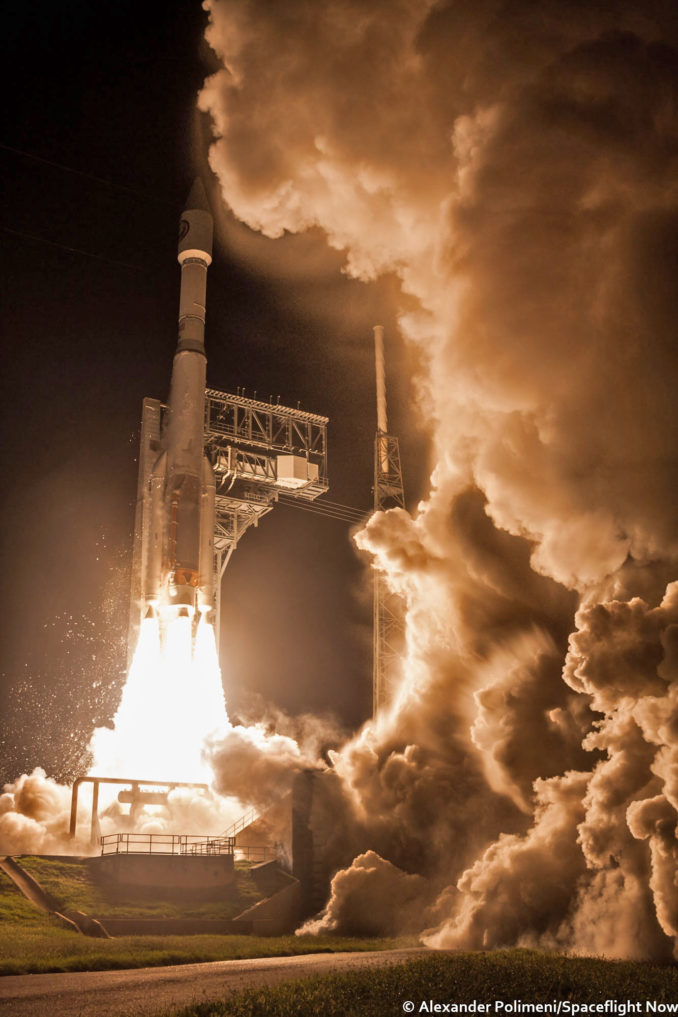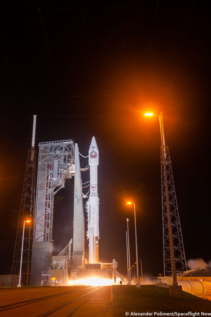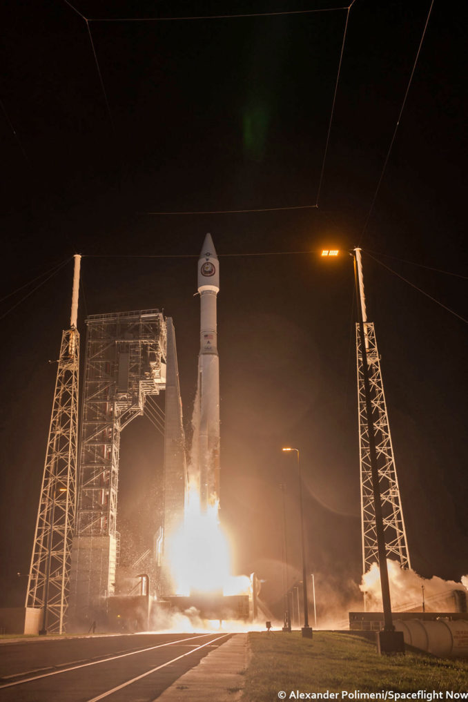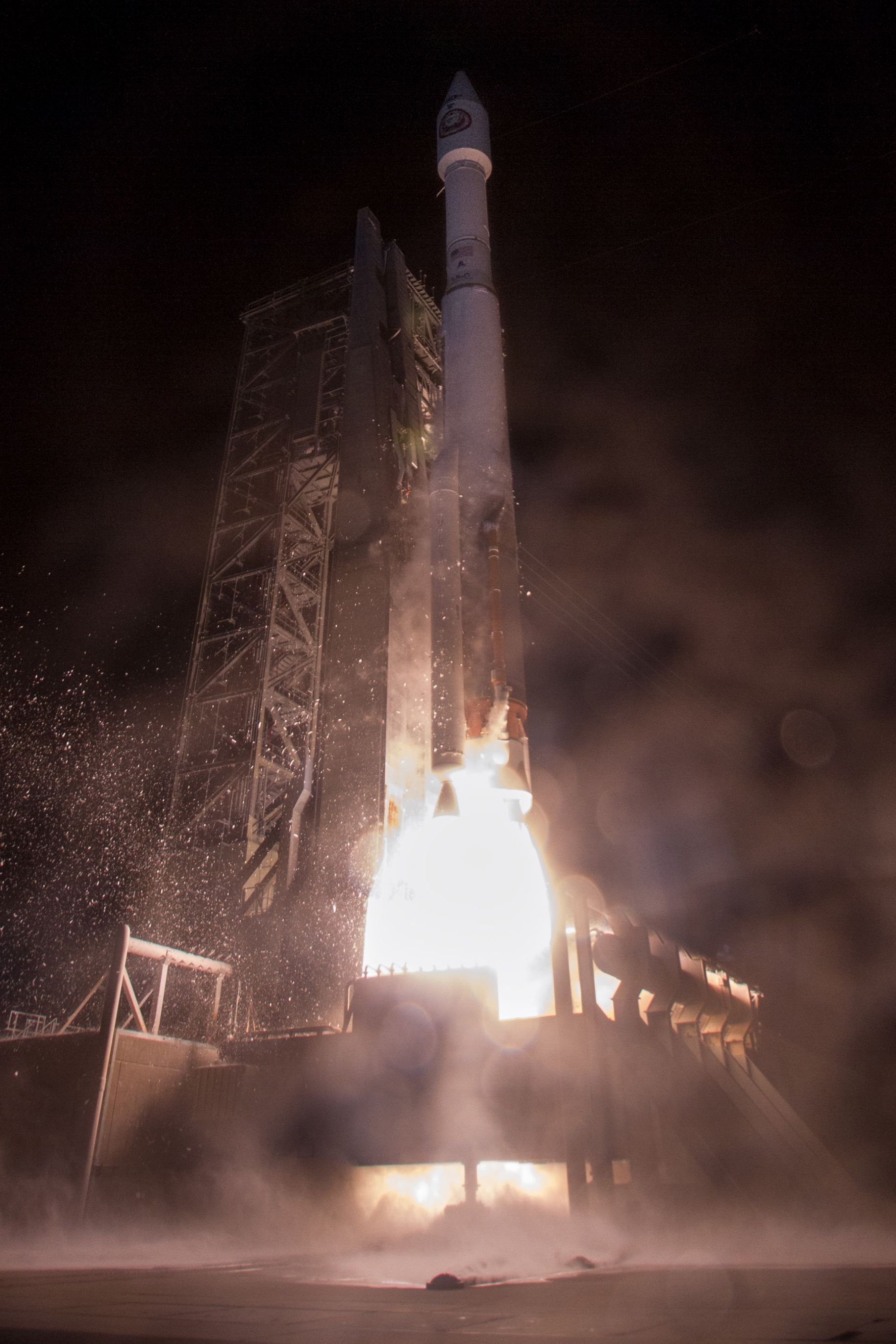 Atlas V came to life at T-3 seconds when the two-chamber RD-180 engine fired up to soar to a launch thrust of 390 metric ton-force under the close supervision of computers to ensure the engine was working properly before committing the vehicle to flight with the ignition of the boosters. Liftoff occurred at 7:28:00 UTC when Atlas V fired up its twin Solid Rocket Boosters to leap off its pad with a thrust of 735 metric ton-force.