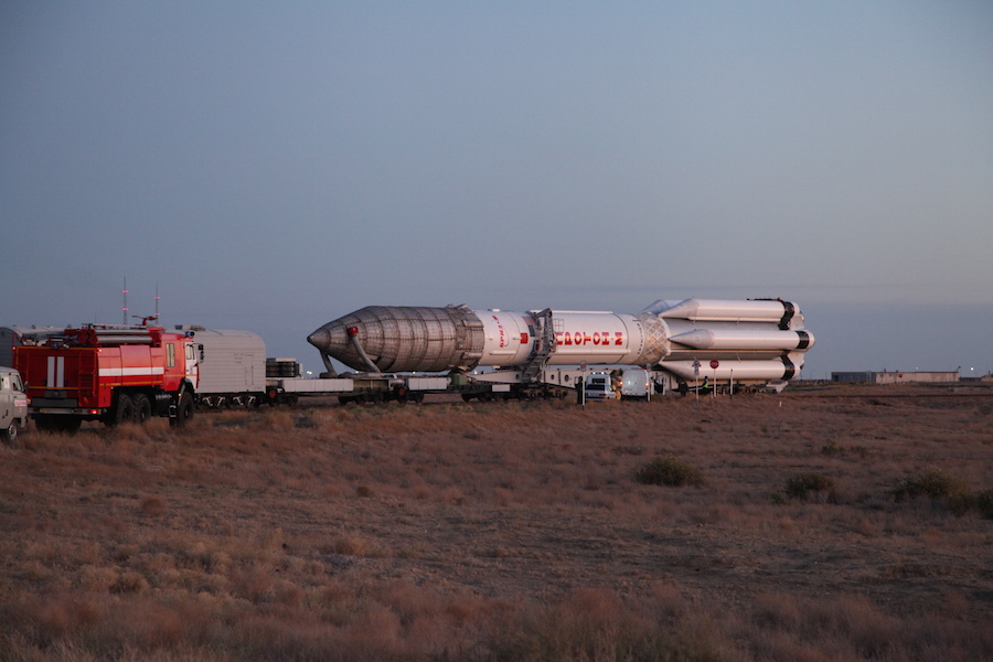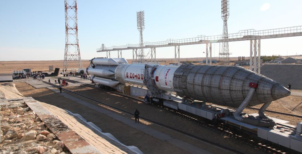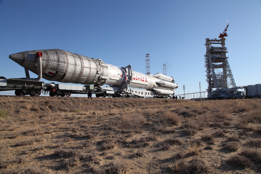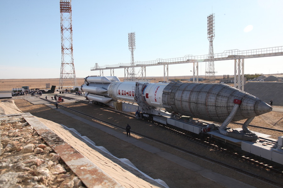 A Russian Proton rocket rolled out to its launch pad Monday at the Baikonur Cosmodrome in Kazakhstan with the AsiaSat 9 satellite on-board. Video credit: Roscosmos