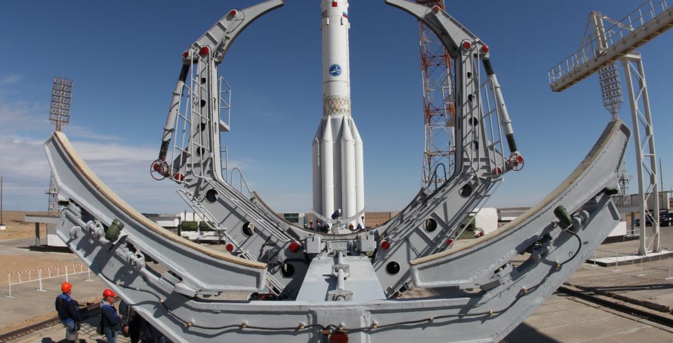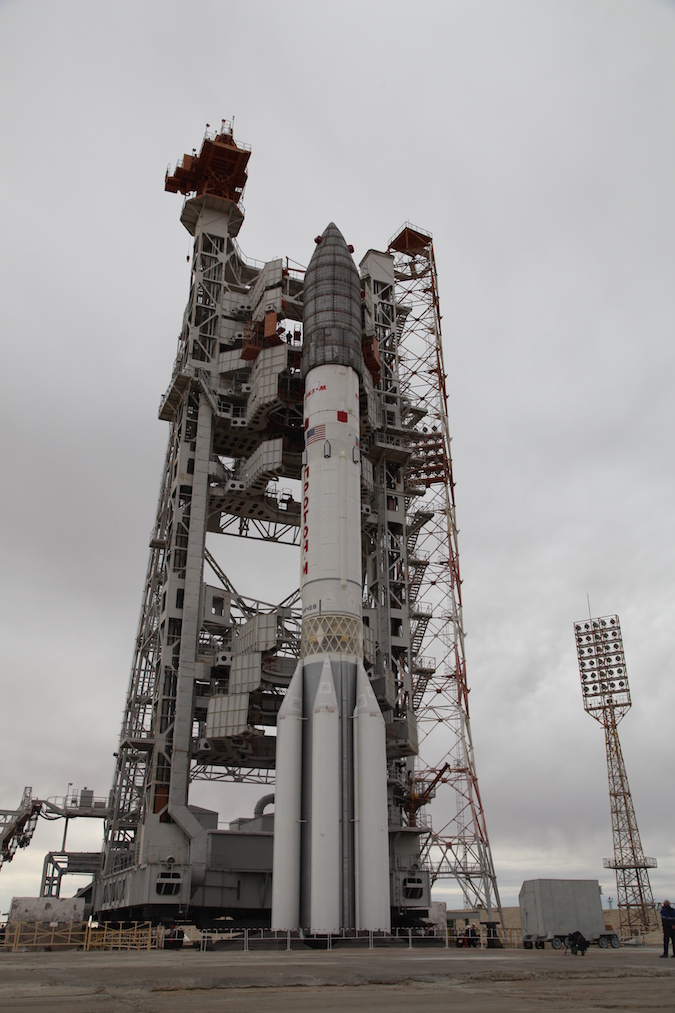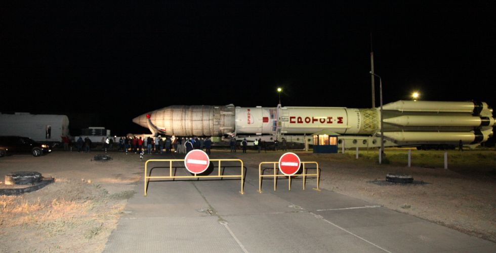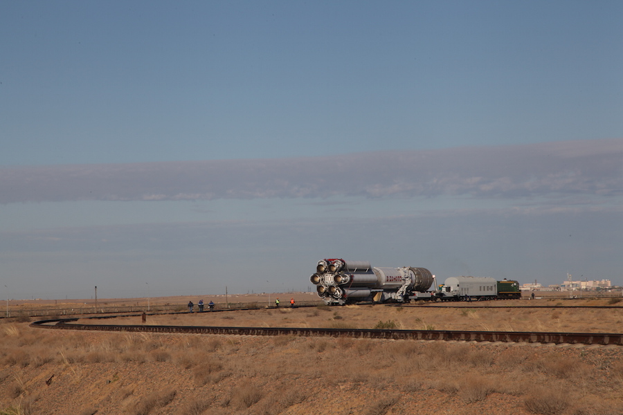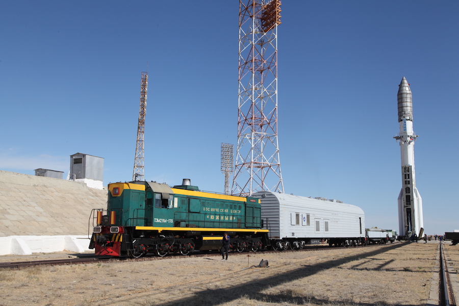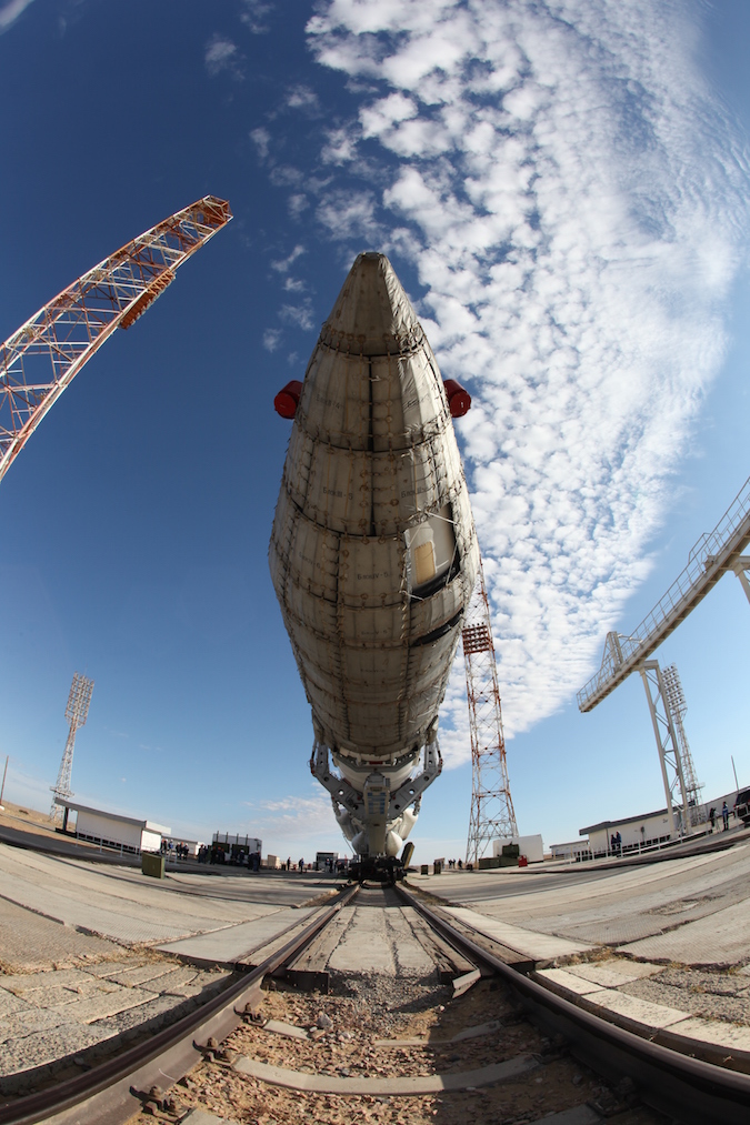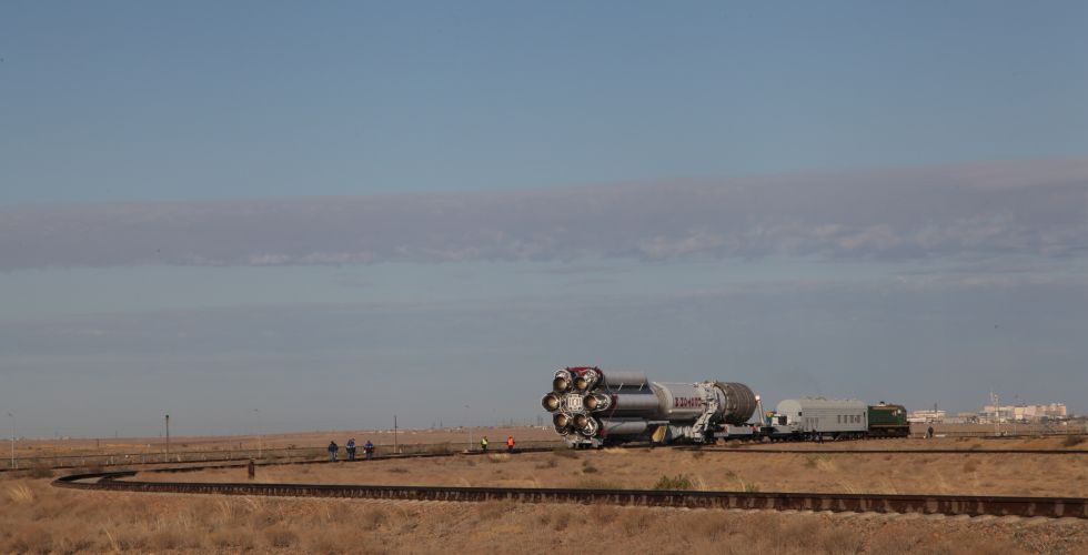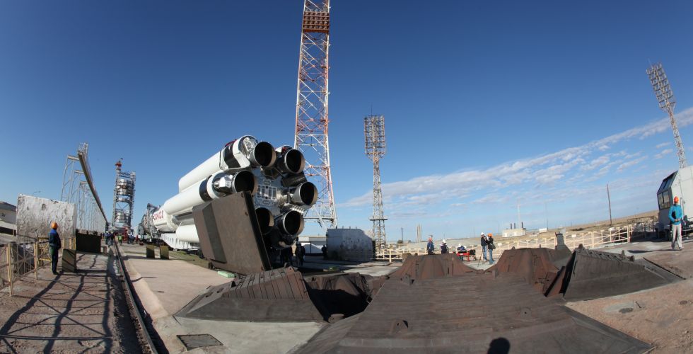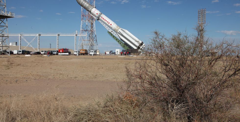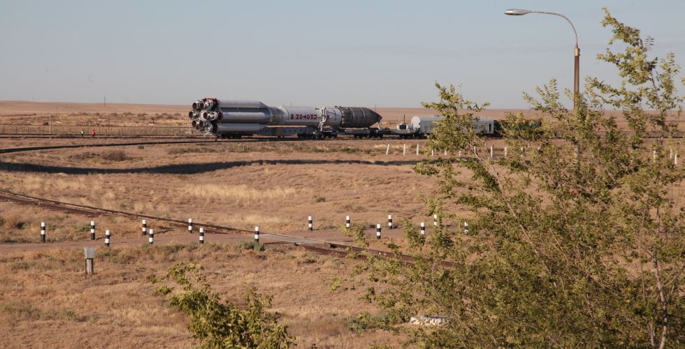 the Baikonur Cosmodrome in Kazakhstan, with the