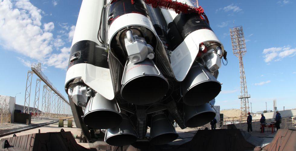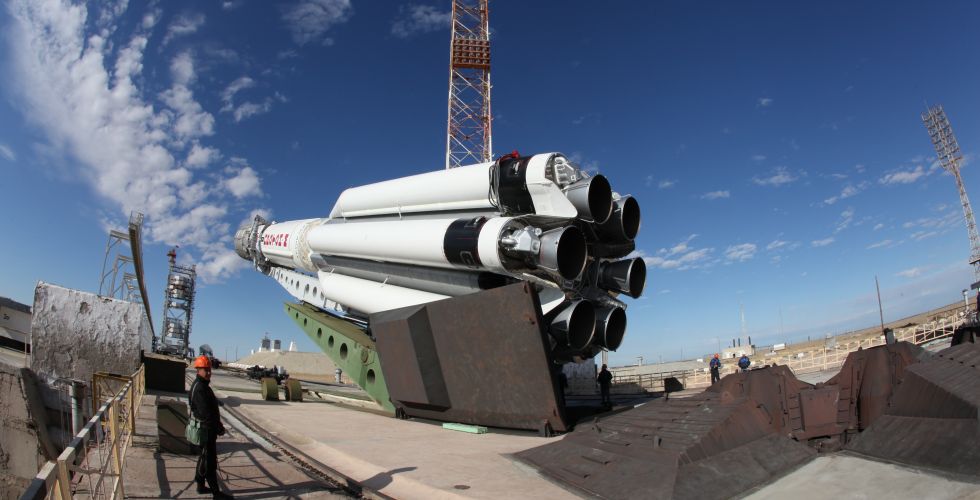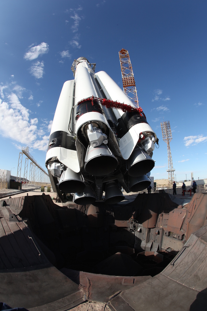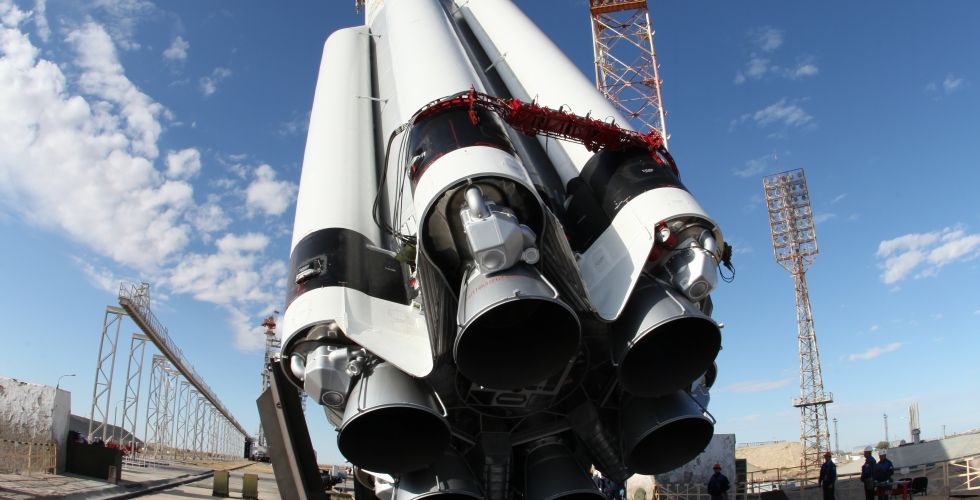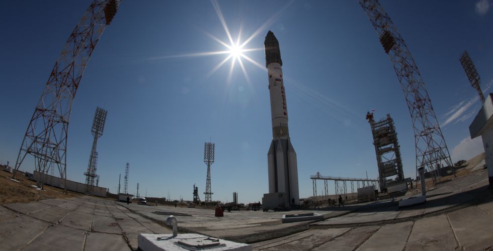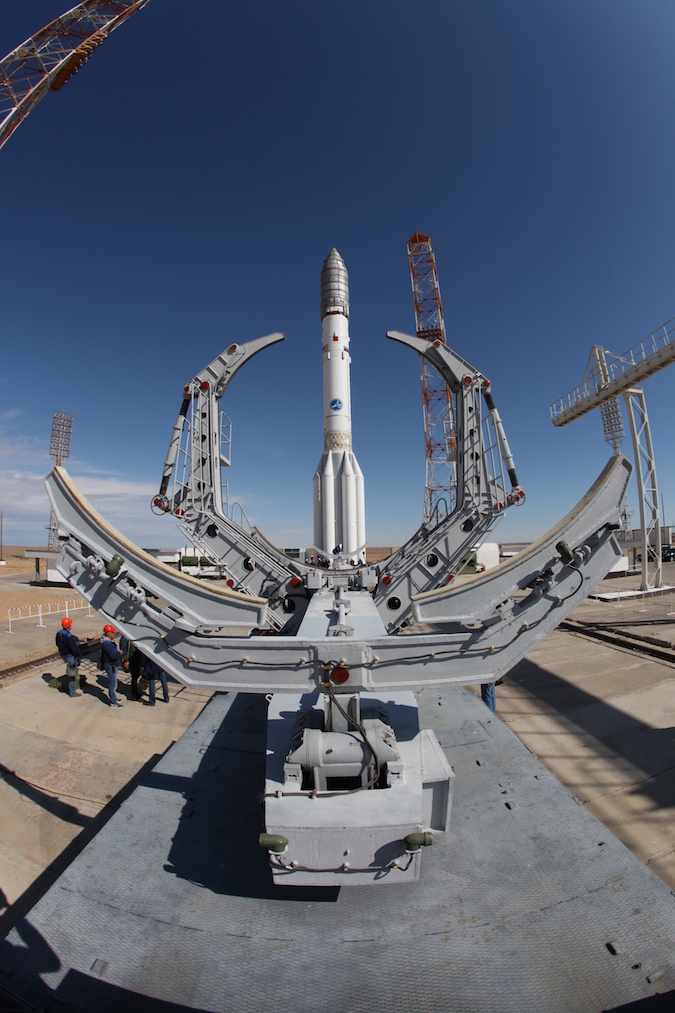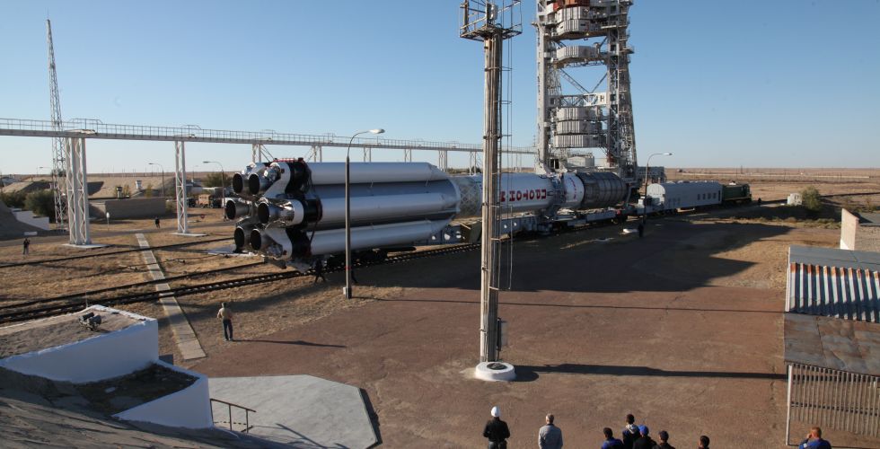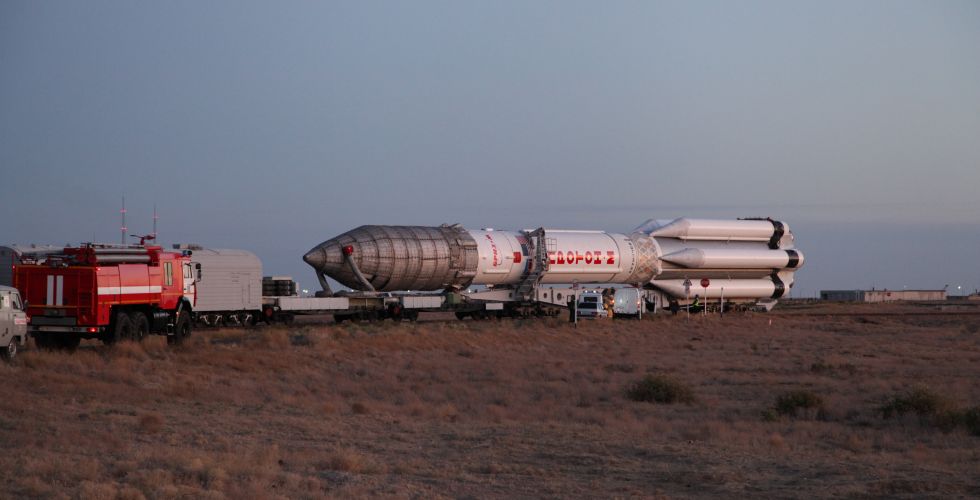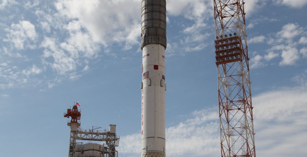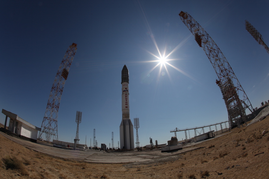 the Baikonur Cosmodrome in Kazakhstan, with the