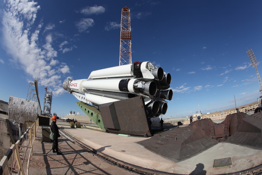 The 191-foot-tall (58-meter) rocket will ignite its six liquid-fueled RD-276 main engines and climb away from the spaceport on the Kazakh steppe at 12:52 a.m. local time Friday.
