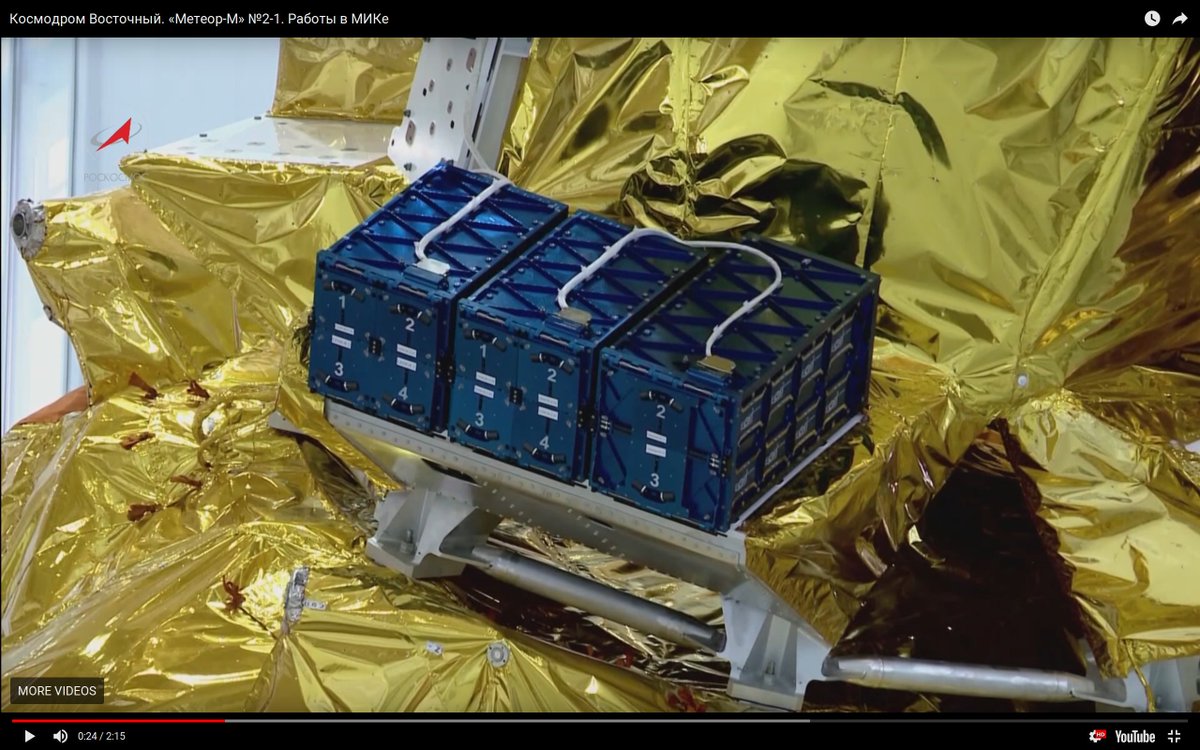 The secondary payloads sit around the base of the Meteor sat. The blue triple cube deployer set is at bottom here; another 4 x 3U blue deployer at is center, for a total of 12 of the 3U cubesats: 10 @spireglobal Lemur-2, plus @GermanOrbital D-Star and #KTH (Stockholm)'s SEAM