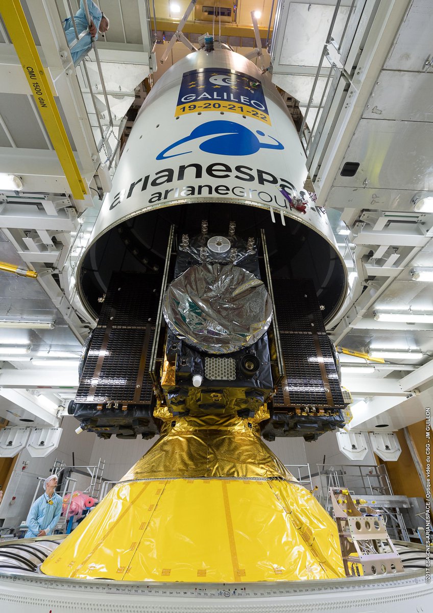 4 спутника Galileo были установлены на переходнике-диспенсоре. После чего настала очередь установки головного обтекателя Ariane 5. Четыре спутника будут запущены на круговую орбиту MEO (Medium Earth Orbit).