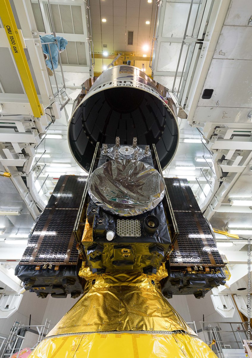 The fully-integrated payload stack moved to the Ariane 5's final assembly building Nov. 28, and cranes hoisted the satellites and their carrier module atop the launcher Nov. 29. The Ariane 5's composite 17.7-foot (5.4-meter) diameter nose shroud was lowered over the satellites Nov. 30 to complete the rocket's assembly.