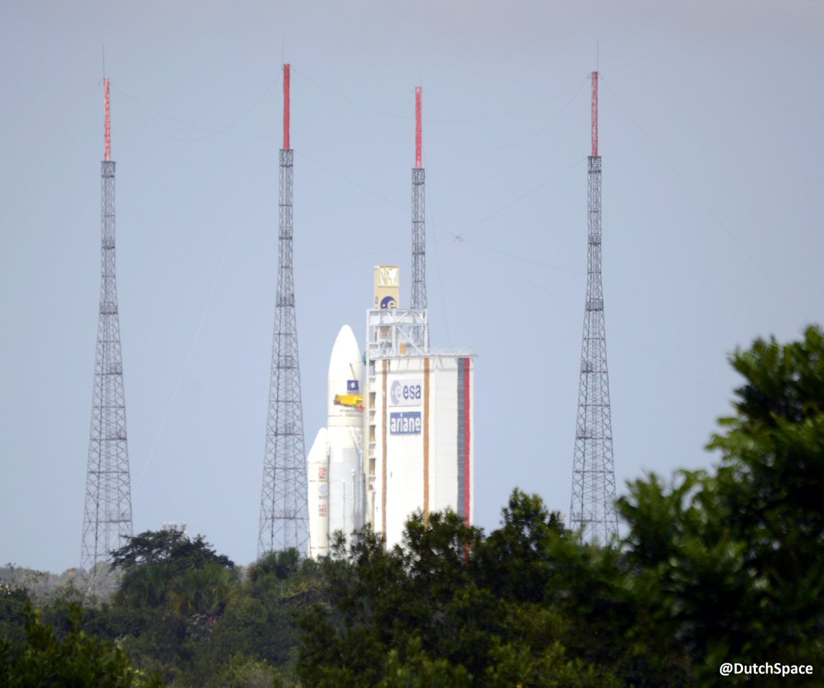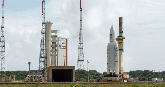 Liftoff of the Ariane 5 rocket is set for an instantaneous launch opportunity at 1836:07 GMT (1:36:07 p.m. EST; 3:36:07 p.m. French Guiana time) Tuesday.