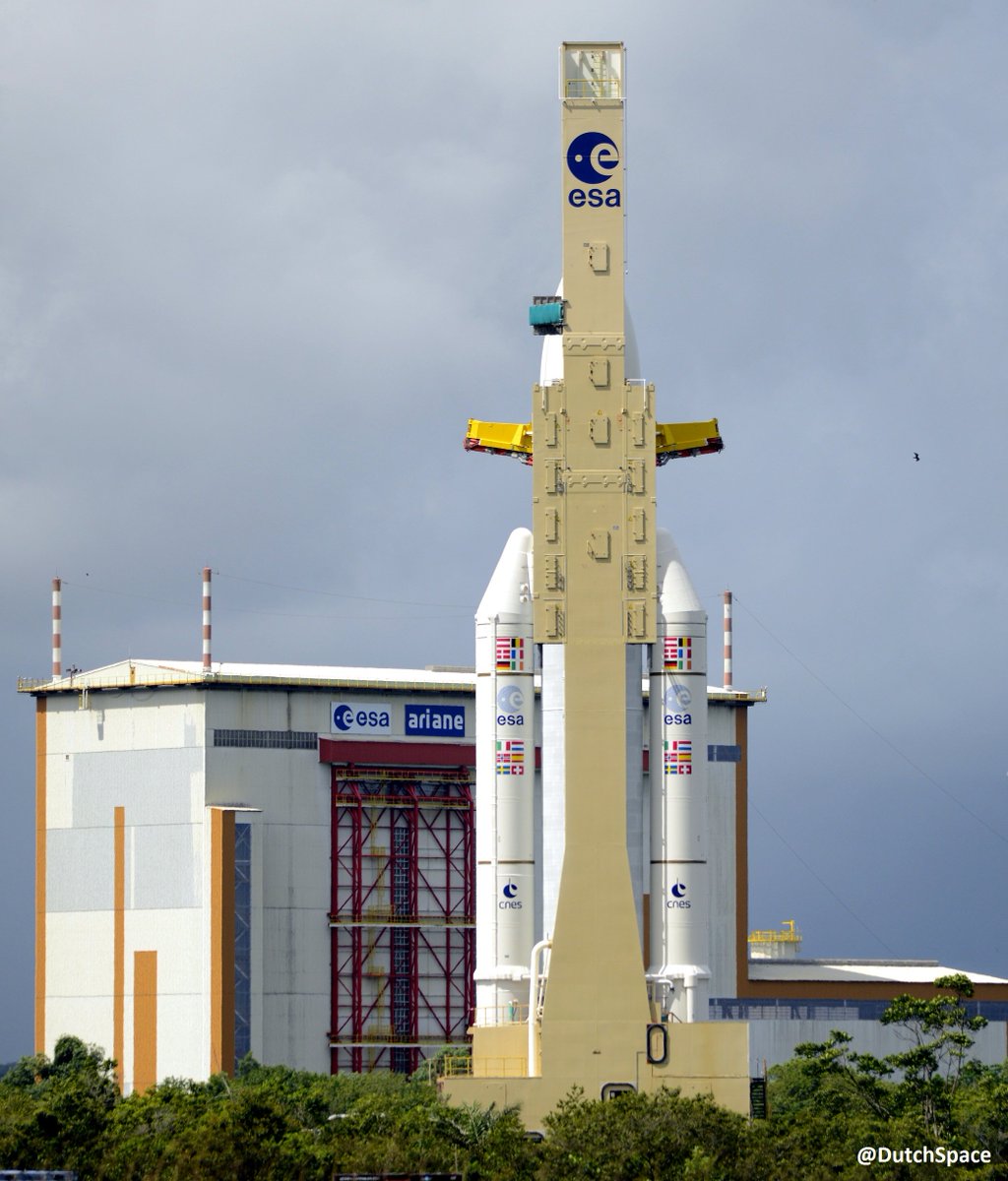 The storable liquid propellants on the Ariane 5's second stage and the pre-packed powder fuel inside the Ariane 5's twin boosters are already loaded.