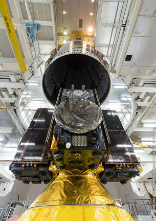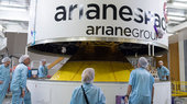 Next, the satellites plus dispenser were placed atop the Ariane 5's upper stage, after which the 14 m-long protective fairing was lowered over the Galileos – the last time they will be seen by human eyes. This fairing will protect them from the onrushing atmosphere during ascent.
