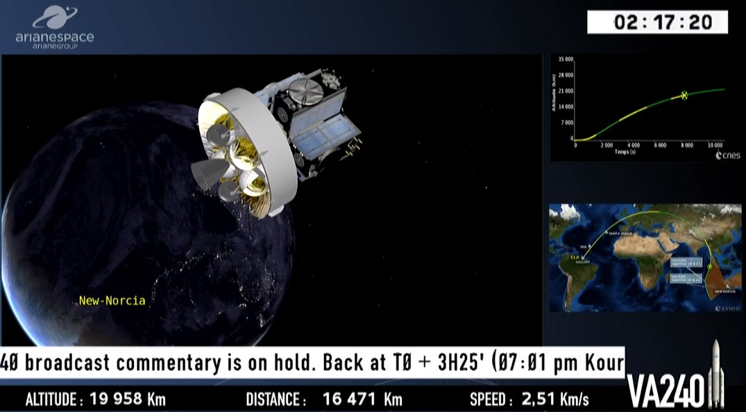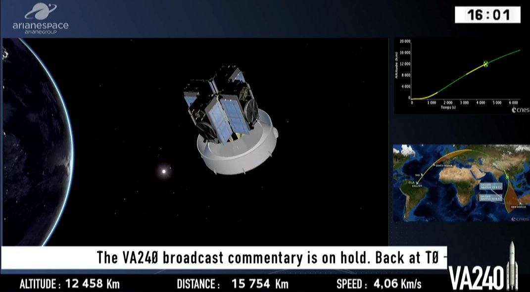 Payload lift performance for today's mission – which is designated Flight VA240 in Arianespace's launcher family numbering system – is estimated at 3,282 kg.