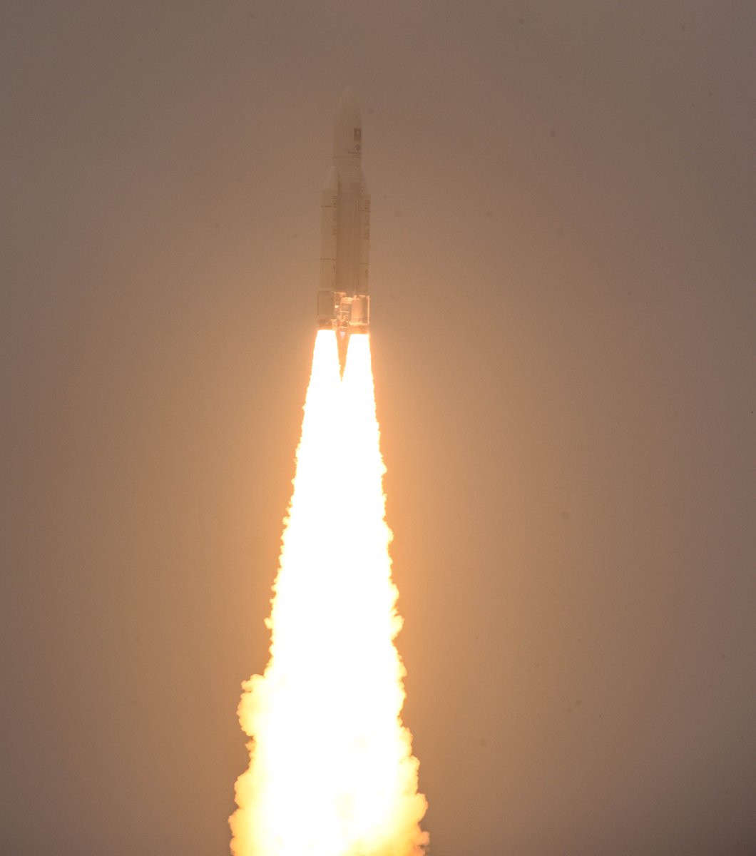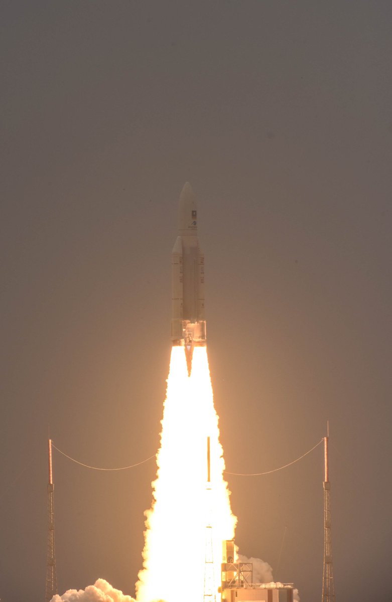 Lifting off at exactly 3:36:07 p.m. local time in French Guiana, the heavy-lift vehicle is to deploy its passengers on a flight lasting approximately 3 hrs., 55 min.