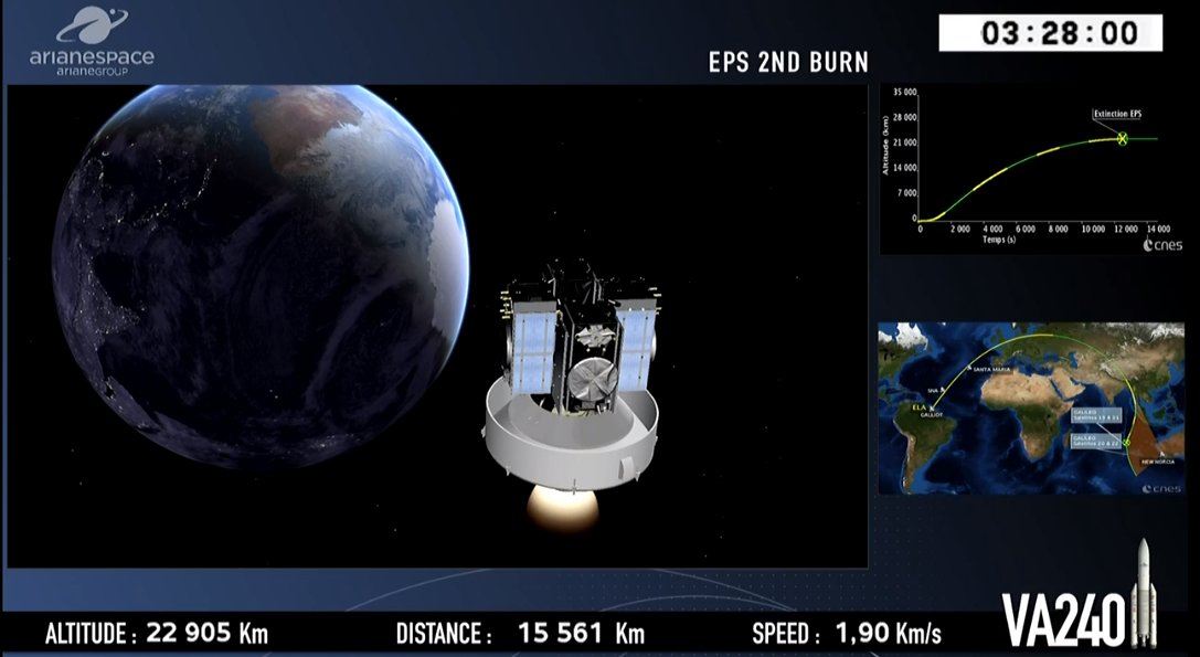 IGNITION! The EPS upper stage fired up its 2,800kgf Aestus engine on a burn of six minutes and 18 seconds to boost #Galileo FM 15-18 into an orbit of 22,922 Kilometers, 57.0°.