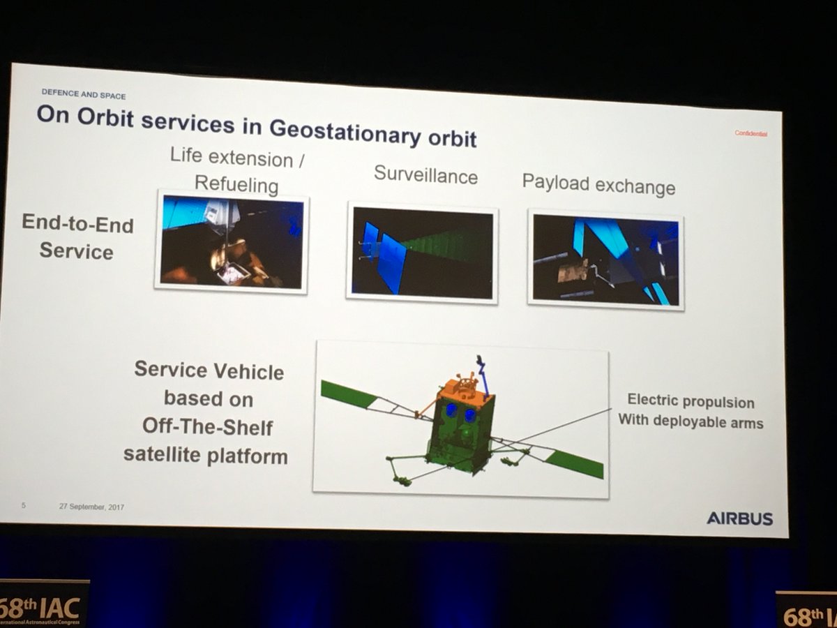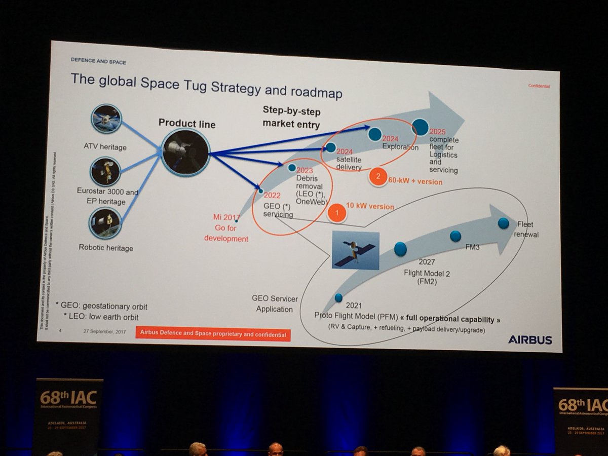 Michel Frezet, Airbus: plan to launch first Space Tug satellite servicing spacecraft in late 2021 to provide wide range servicing. #IAC2017