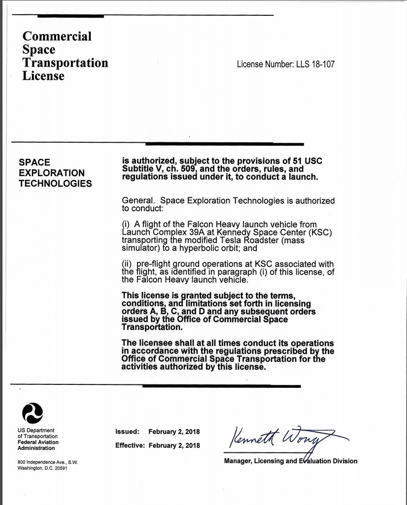 It's not everyday you see an FAA license say "transporting the modified Tesla roadster to hyperbolic orbit." The official launch license is out and Falcon Heavy's maiden flight is still set for this Tuesday, 1:30 p.m.