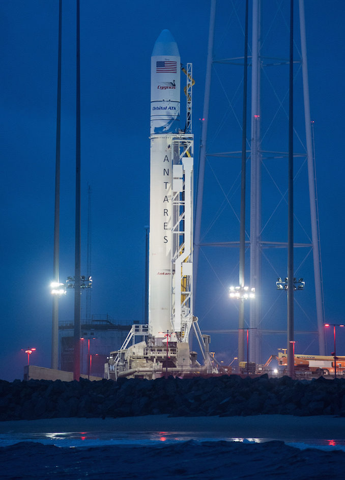 A 139-foot-tall (42.5-meter) Antares rocket is slated for a predawn launch Monday from the Mid-Atlantic Regional Spaceport on Virginia's Eastern Shore, carrying a Cygnus supply ship heading for the International Space Station.