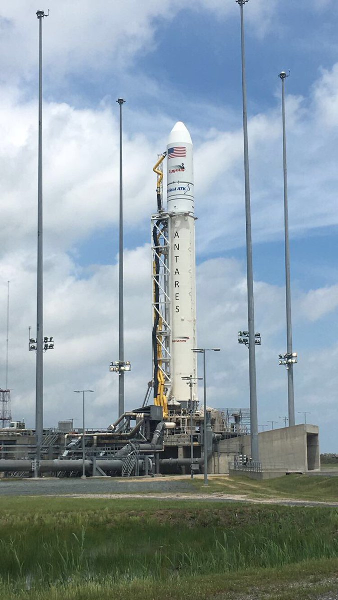 The weather is lifting for a moment at @NASA_Wallops and we're excited to share a sunny shot of #Antares and #Cygnus on the pad