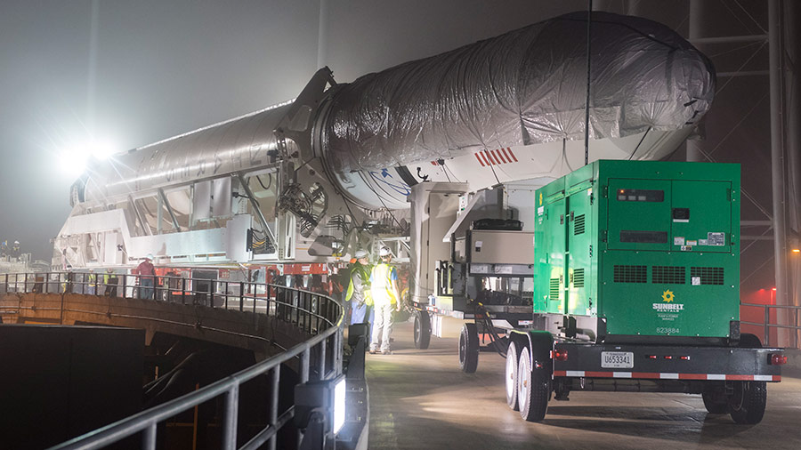 Technicians finished packing 7,205 pounds (3,268 kilograms) of equipment, experiments and provisions inside the Cygnus spacecraft's pressurized compartment Wednesday, then installed the Antares rocket's payload shroud over the cargo craft ahead of Thursday night's rollout.